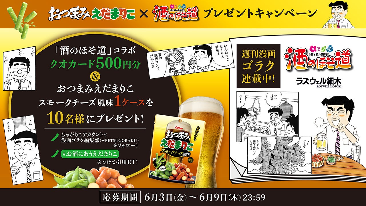 応募方法:漫画ゴラク公式Twitterアカウント(@BETSUGORAKU)とじゃがりこ公式Twitterアカウント(@jagarico_cp)をフォローした上、【#お酒に合うえだまりこ】をつけてキャンペーン投稿を引用リツイートして応募。