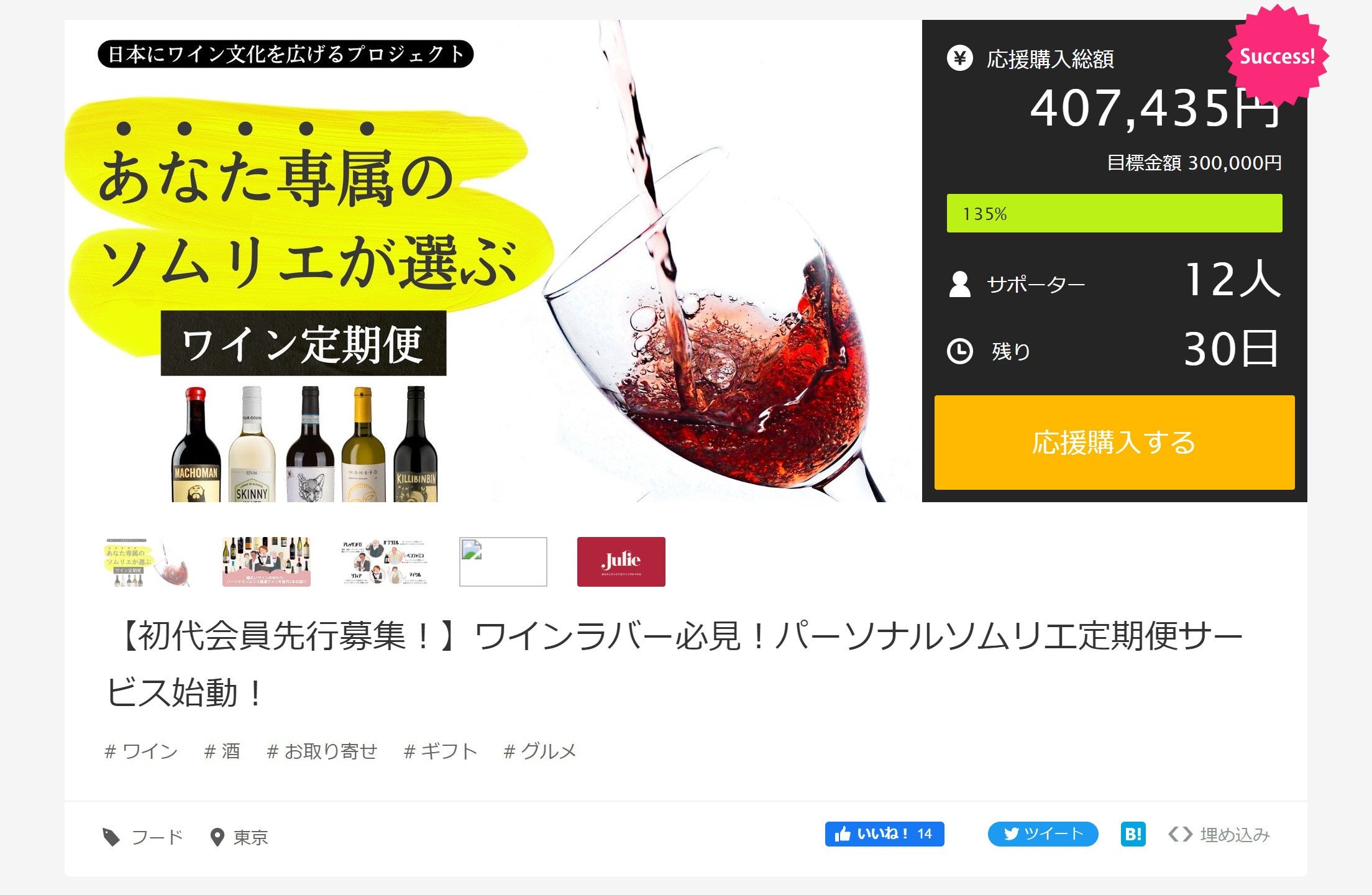 株式会社ニューバリューフロンティア(本社:渋谷区広尾、代表取締役:髙宮孝一郎)が運営する、世界中のワインとお客様を結ぶワイン専門のECサイト「Julie(ジュリー)」では、5月27日(金)18時よりアタラシイものや体験の応援購入サービス“Makuake”にて、『ワイン定期便』の先行販売を開始。公開初日で目標としていた金額を達成しました。