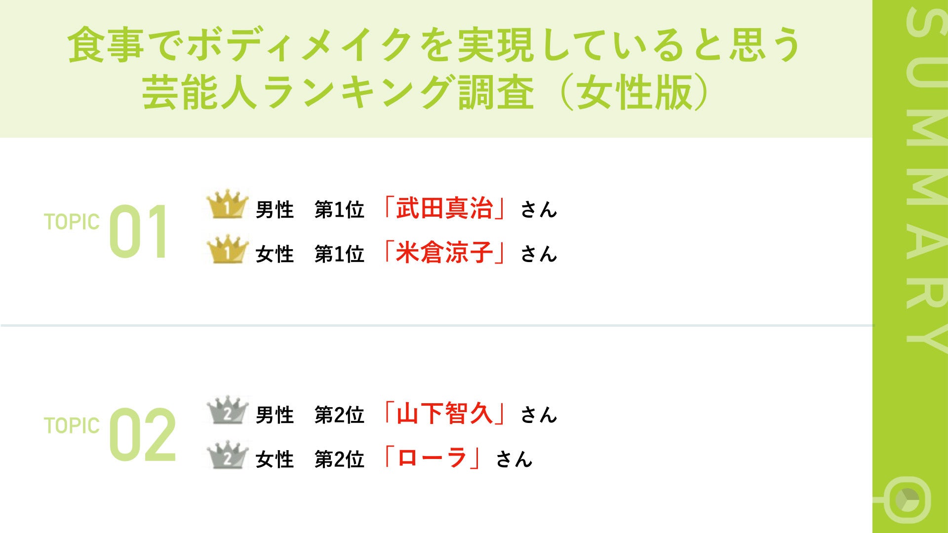 そして、食事でボディメイクを実現していると思う芸能人について伺うと、男性では第1位「武田真治さん」、第2位「山下智久さん」、女性では第1位「米倉涼子さん」、第2位ローラさん」という結果になりました。