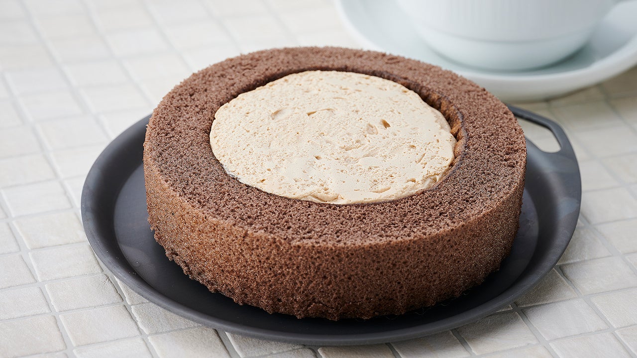 ほろ苦いエスプレッソコーヒークリームが味わえる、大人のロールケーキです。生クリームを加えコクも感じられるクリームに仕上げました。周りのスポンジケーキはココア風味です。