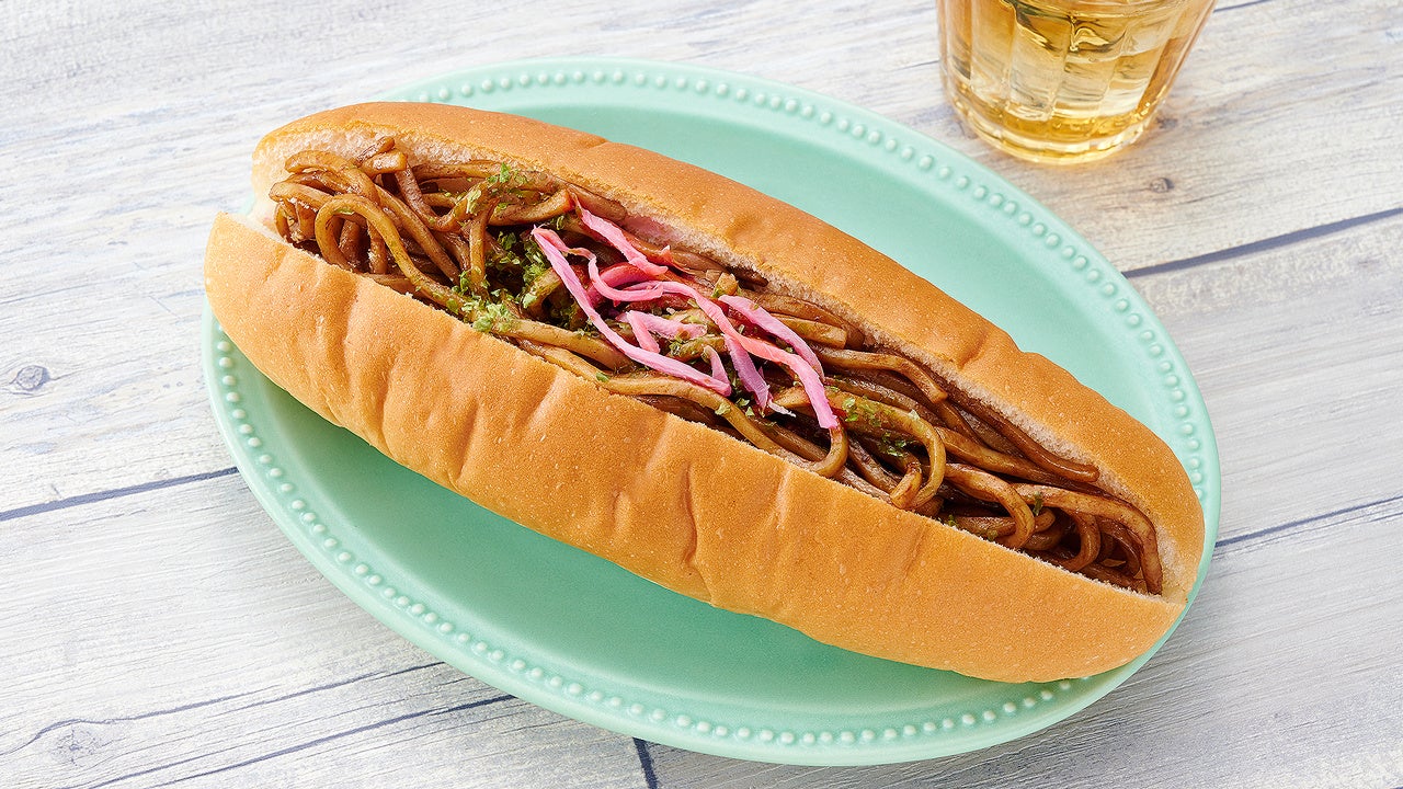 群馬県「太田焼そば」をイメージした焼そばをはさみました。『太田焼そばのれん会』の監修商品です。