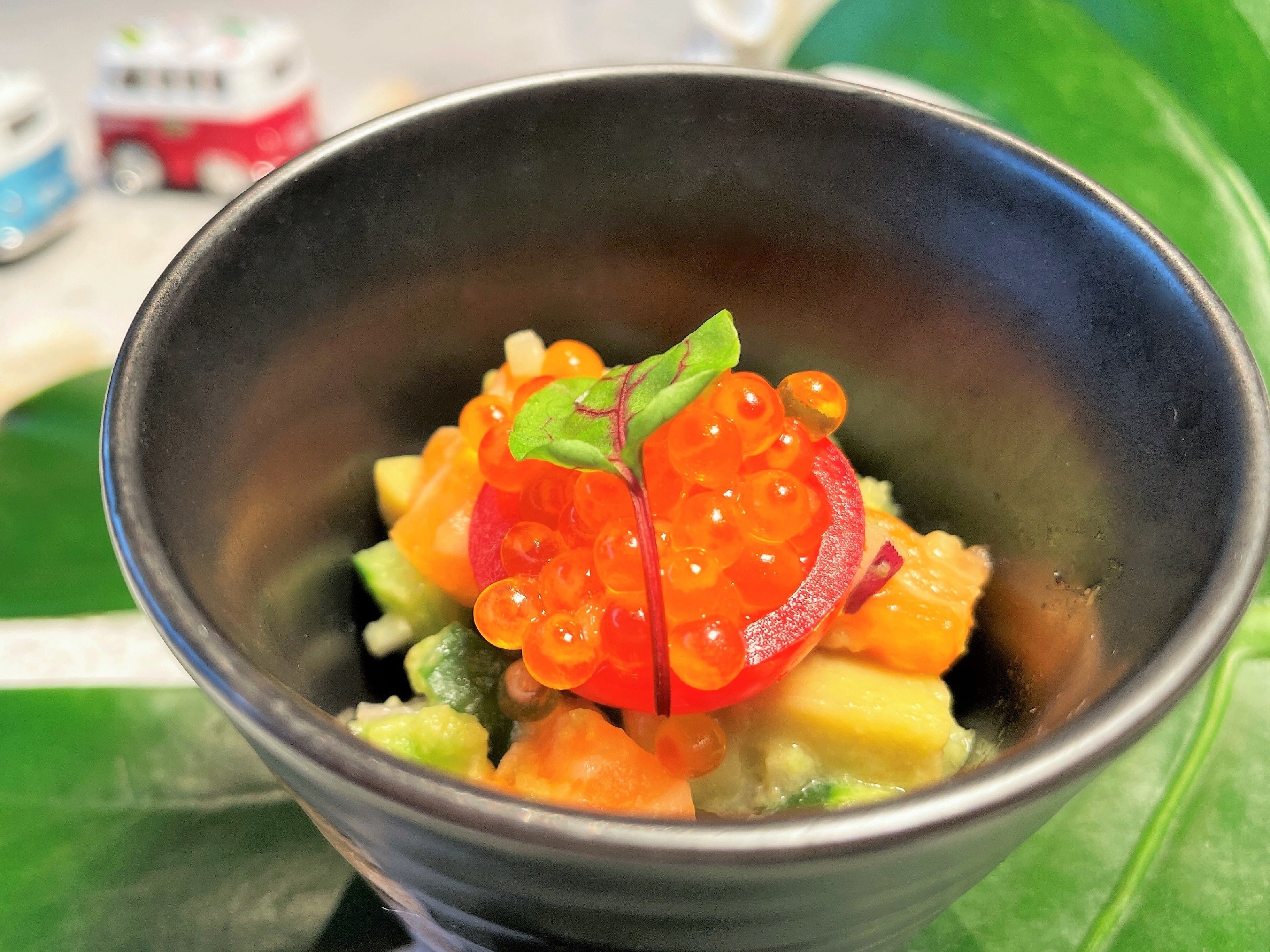 ”ロミロミ”はハワイ語でマッサージするという意味。サーモン、アボカド、キュウリ、サーモンキャビアを器の中でロミロミして、さっぱりとした味わいをお楽しみください。