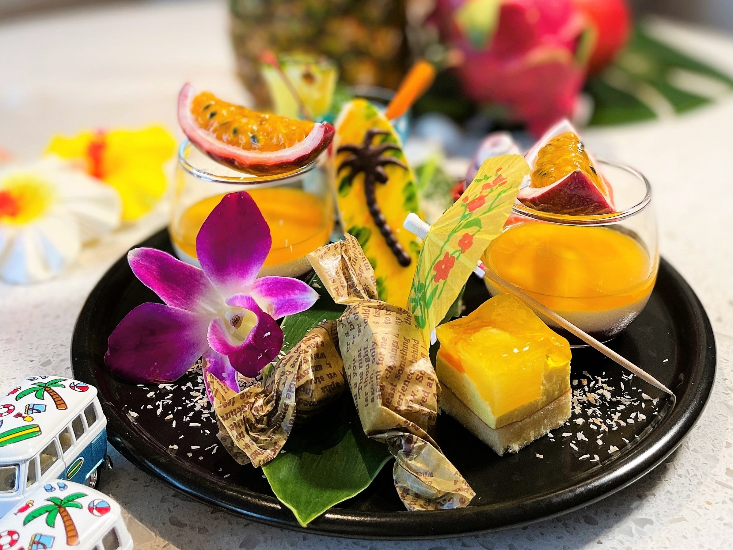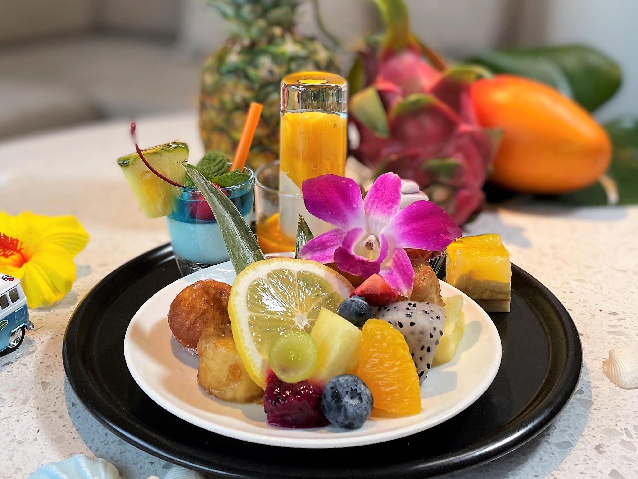 夏のウエルカム・アフタヌーンティーはハワイアン・スイーツたっぷり。ハワイのカフェの人気メニューとハワイ料理をアレンジしたセイボリーをご用意しました。フレッシュなリリコイ(パッションフルーツ)やドラゴンフルーツなどトロピカル・フルーツを贅沢に。