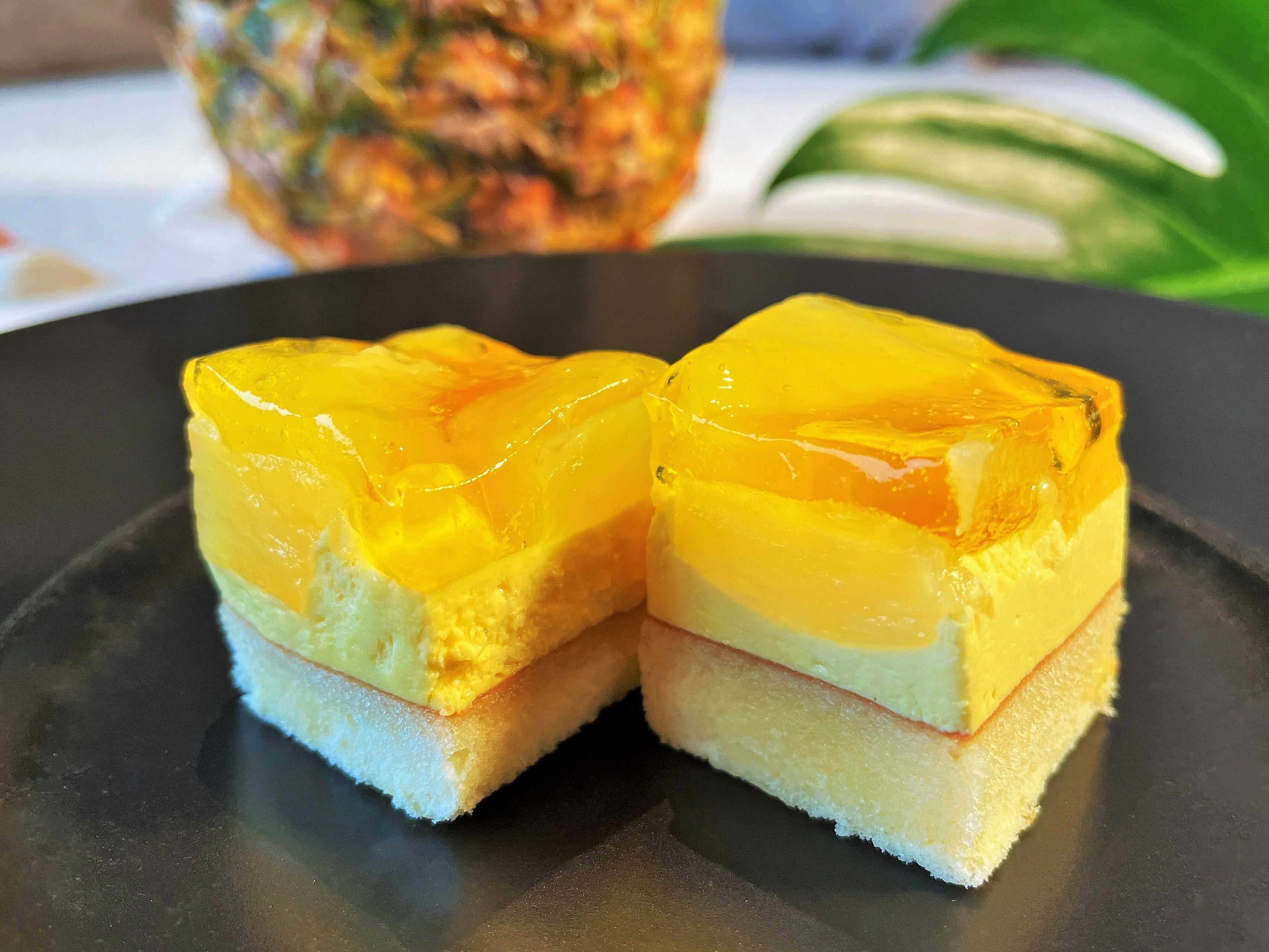 スポンジの上にマンゴームースを重ね、パインとマンゴーの果肉をトッピング。甘くフルーティーなカクテル「ピニャコラーダ」をスイーツで表現しました。