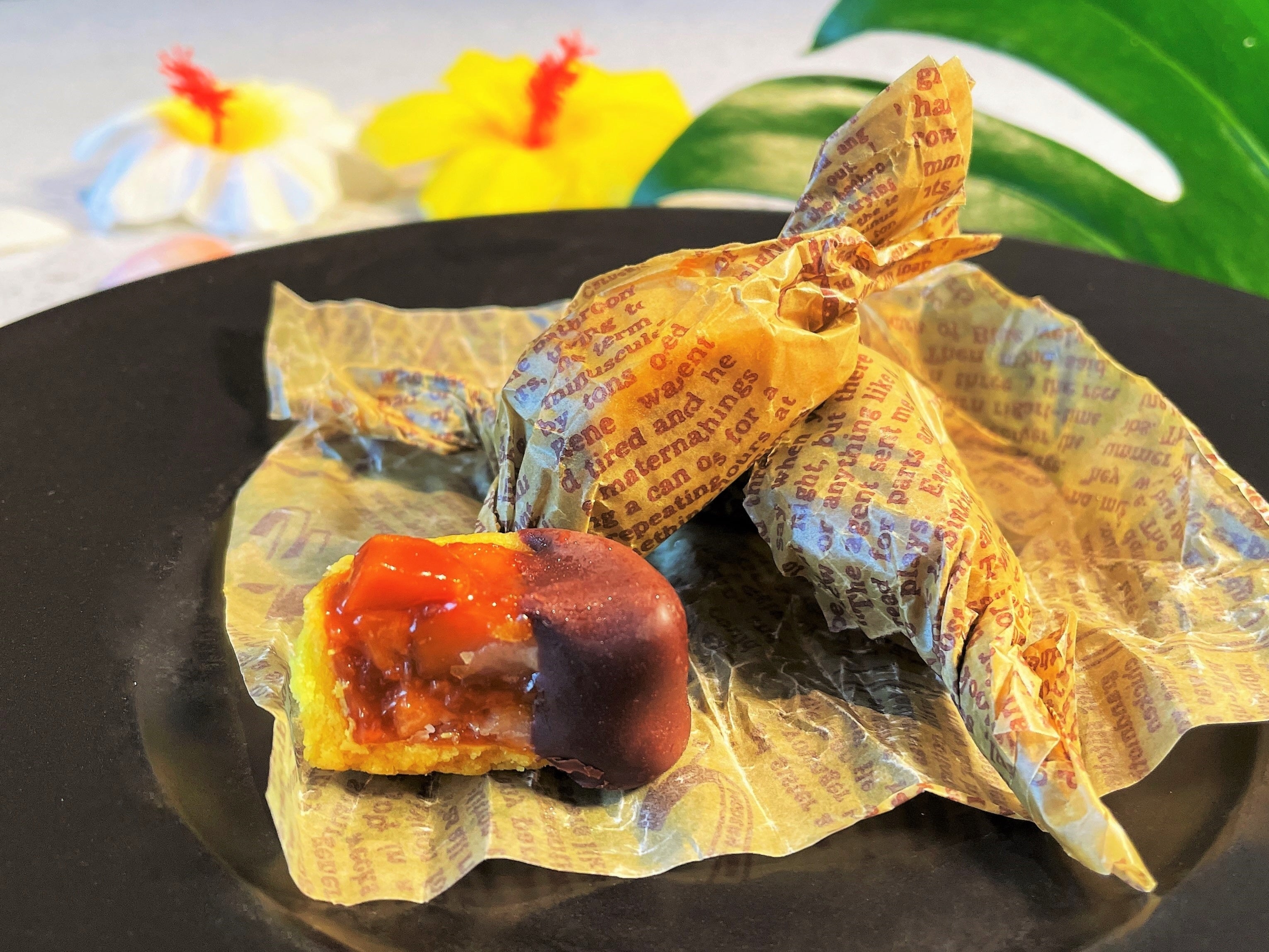 ハワイの定番お土産の「マカダミアナッツチョコレート」をアレンジ。マカダミアナッツにピスタチオを混ぜてヌガーにし、レモンのタルト生地に詰め込みビターチョコレートでほんのりコーティングしています。