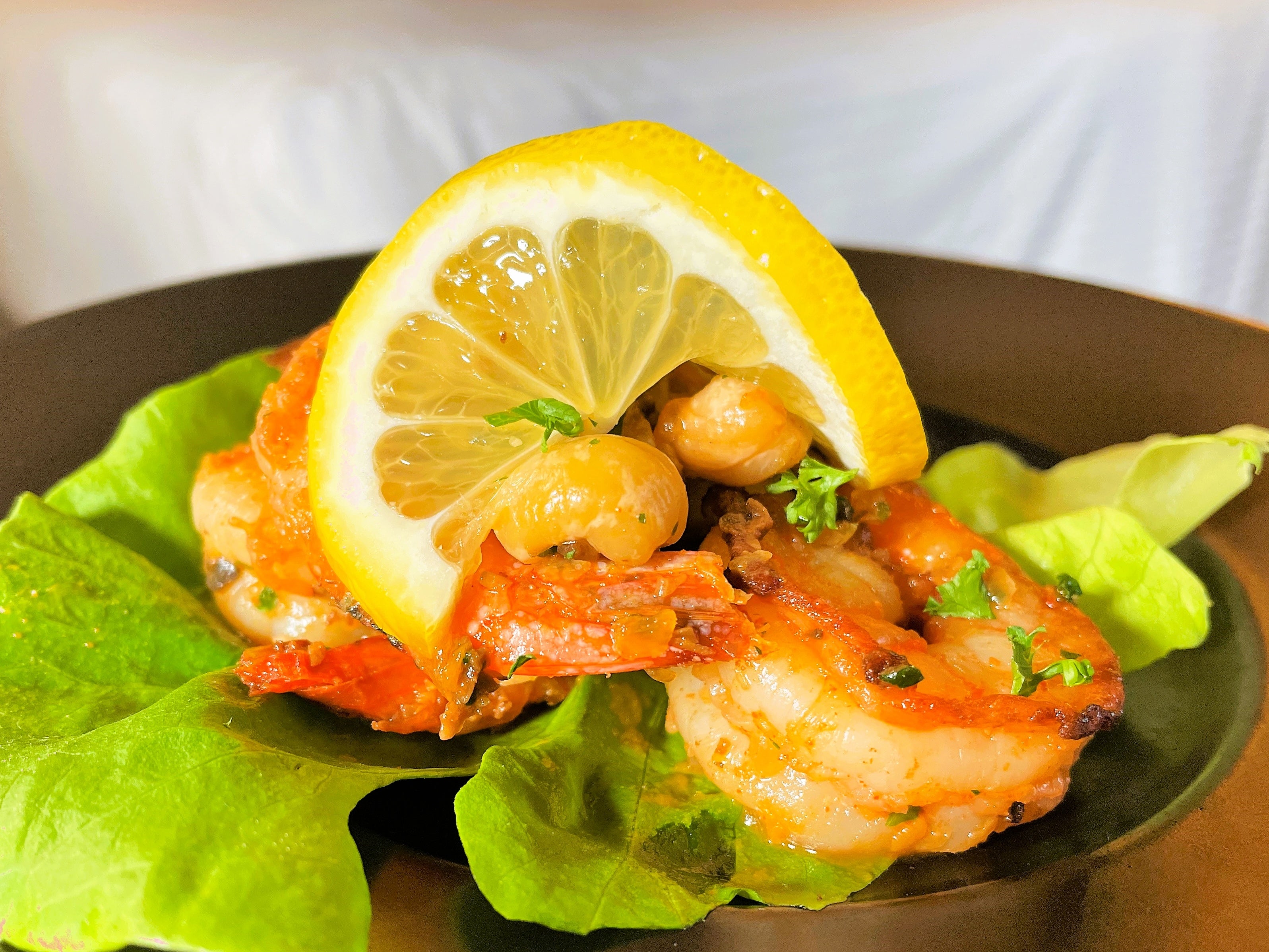 食欲をそそる香ばしいガーリックの風味とまろやかなバター、プリプリ食感な海老をサラダ菜で巻いてお召し上がりください。