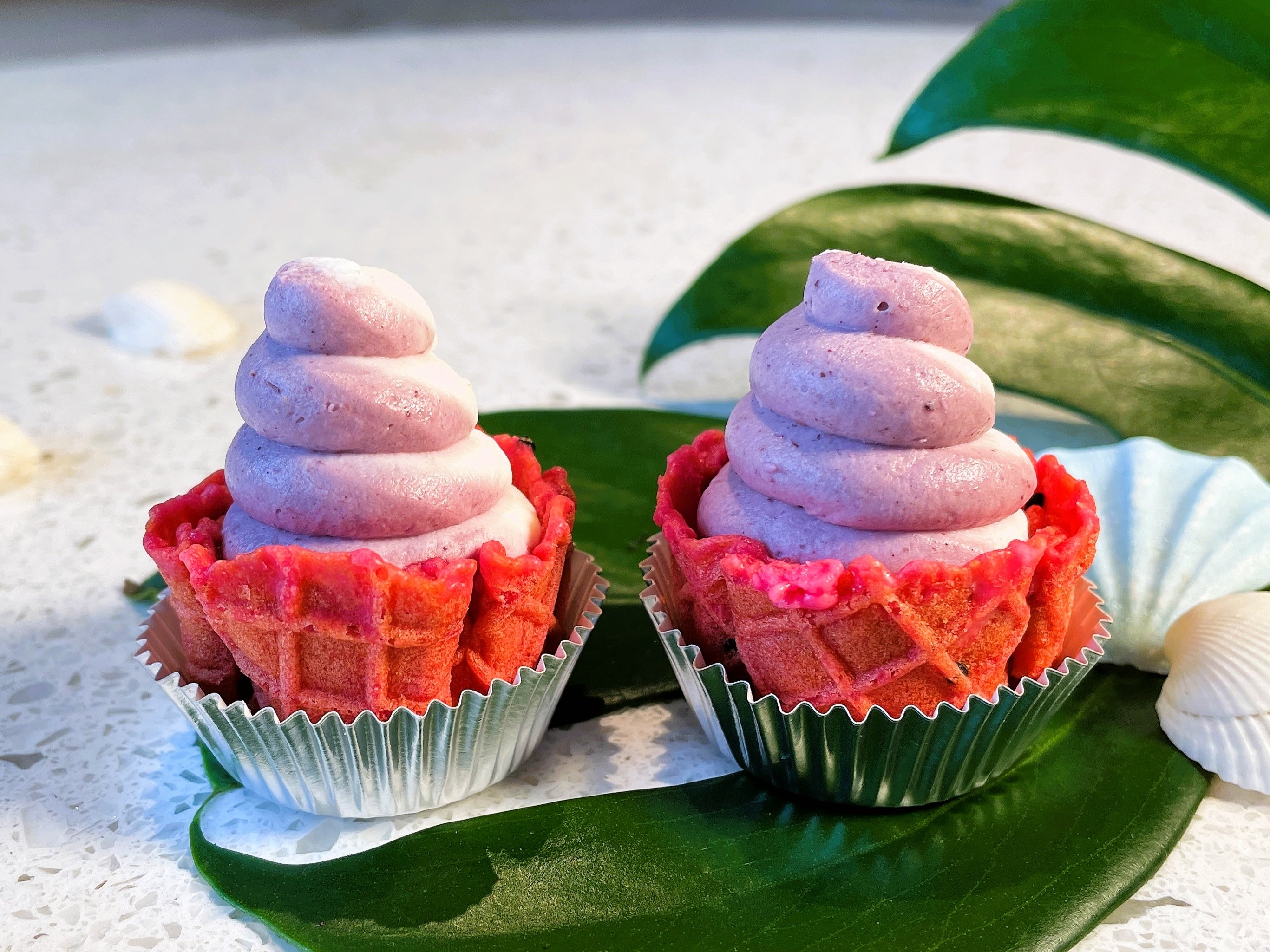 ビーツのバスケットの中にホワイトチョコレートとココナッツのガナッシュを流し、アサイー&カシスとクリームチーズのダブルクリームで、ハワイの定番カラフルなソフトクリームに見立てました。