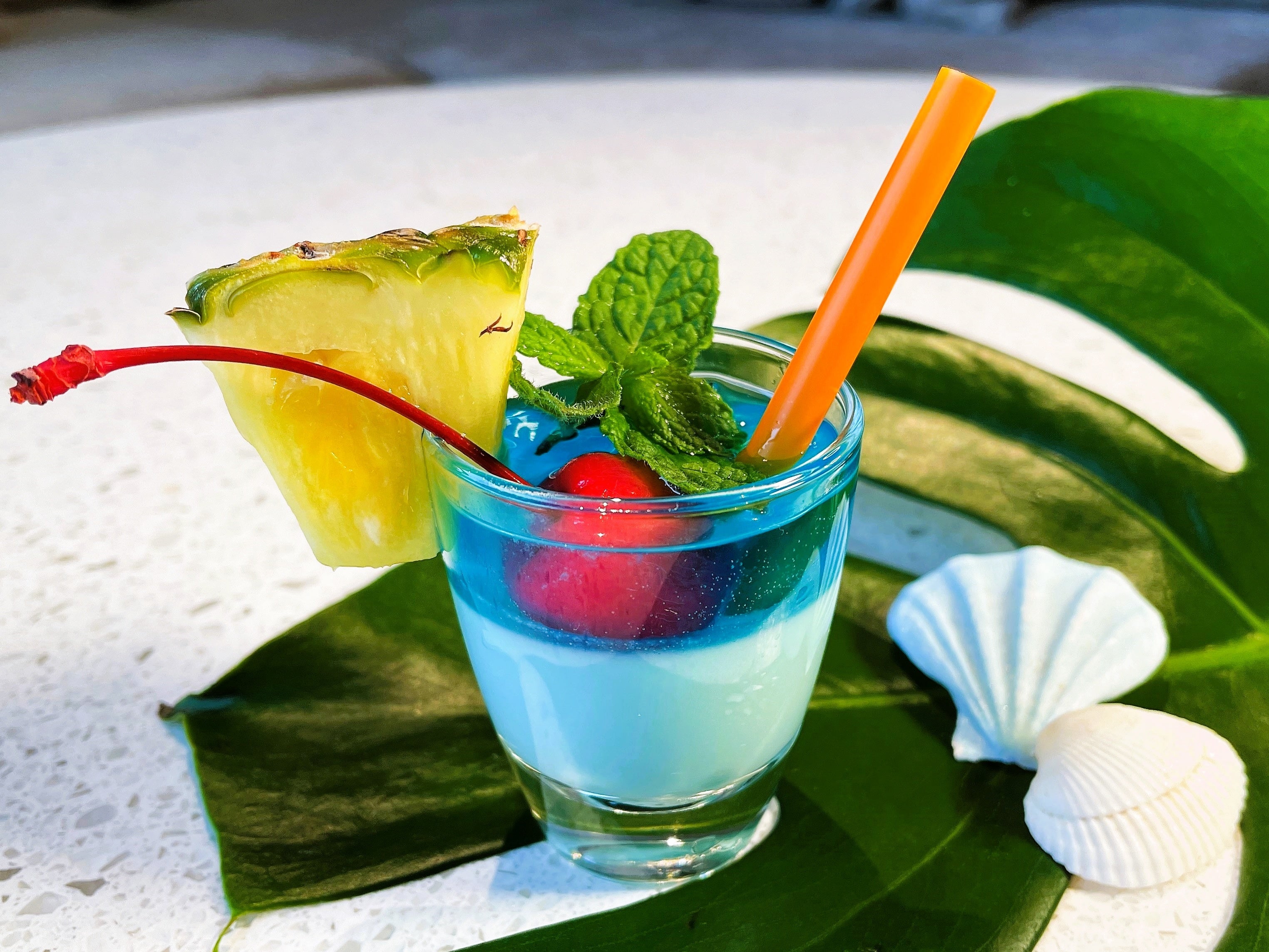 「ブルー・ハワイ」にココナッツミルクなどを加えて作る常夏のカクテル「ブルーハワイアン」。ココナッツミルクプリンにブルーキュラソーを加えてアレンジしました。
