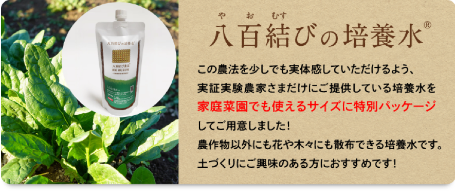さらに今回「八百結び農法®」を少しでも実体感していただくために、現在実証実験にご参画されている農家さまへのみご提供している「八百結びの培養水®」を家庭菜園でもご使用できるサイズに特別パッケージした返礼品もご用意しています。農作物以外にも花や木々にも散布できる培養水なので、家庭菜園においても「土づくりからはじめたい」と考えられている方に是非ご支援賜れれば幸いです。