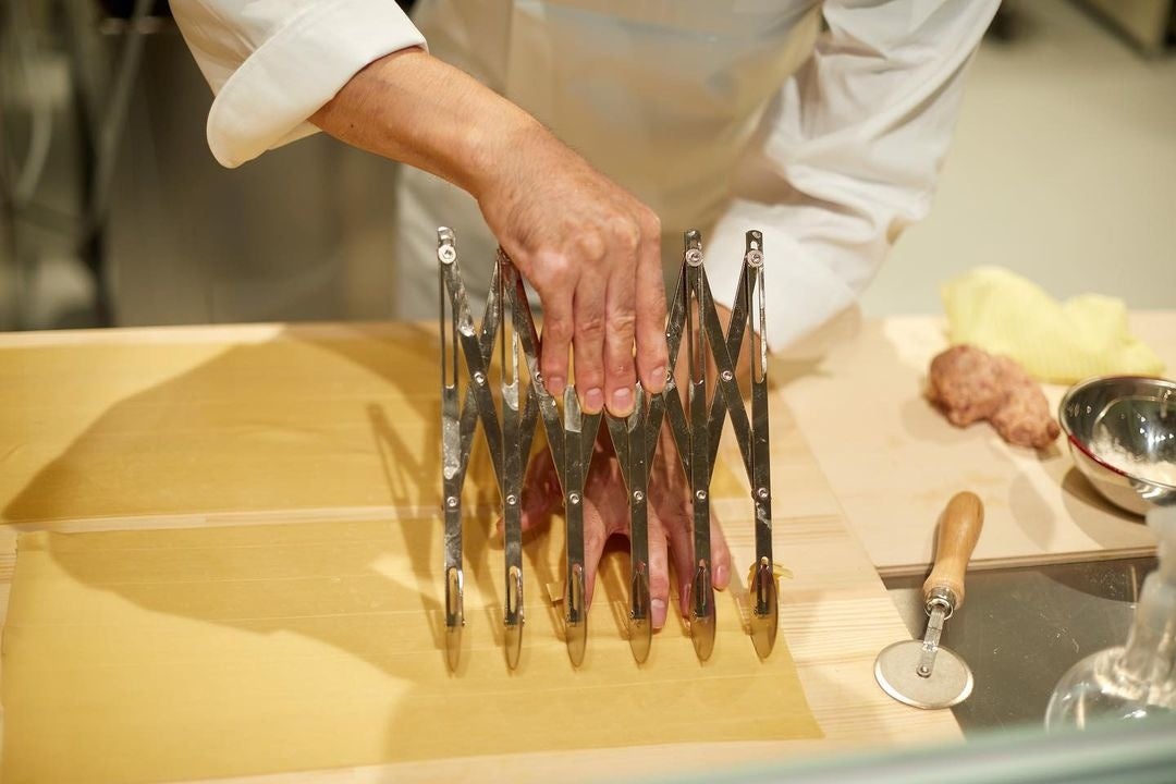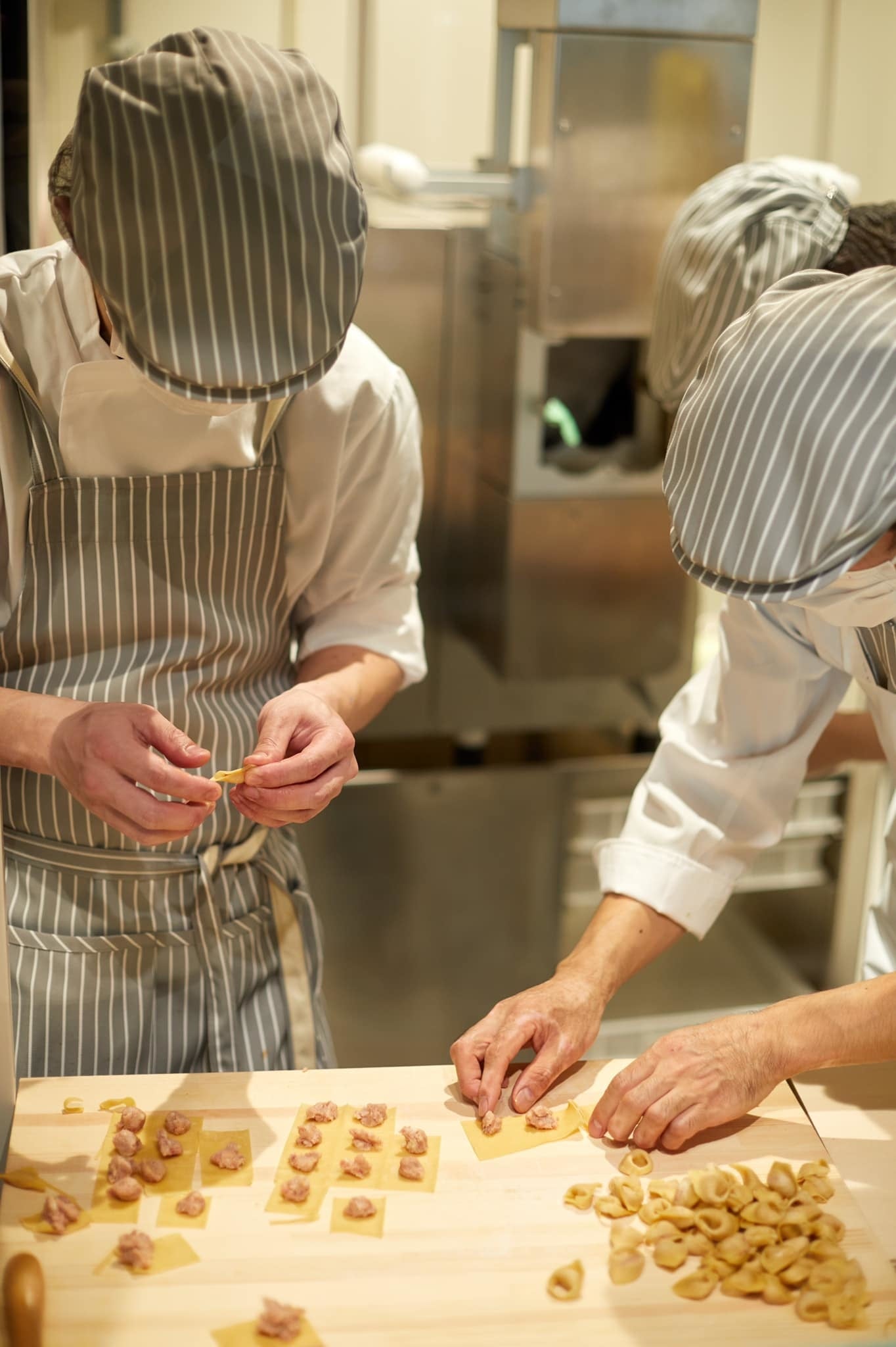 店内奥の工房にイタリア製のパスタマシーンを2台を導入。トルテッリーニ、ラヴィオリ、タイアテッレ、ラザーニャなど様々な形状のパスタをハンドメイドもおり混ぜ作ります。その原料には、非遺伝子組み換え飼料で育つ平飼い卵や、国産有機小麦粉をはじめ、最高品質のものを使用いたします。