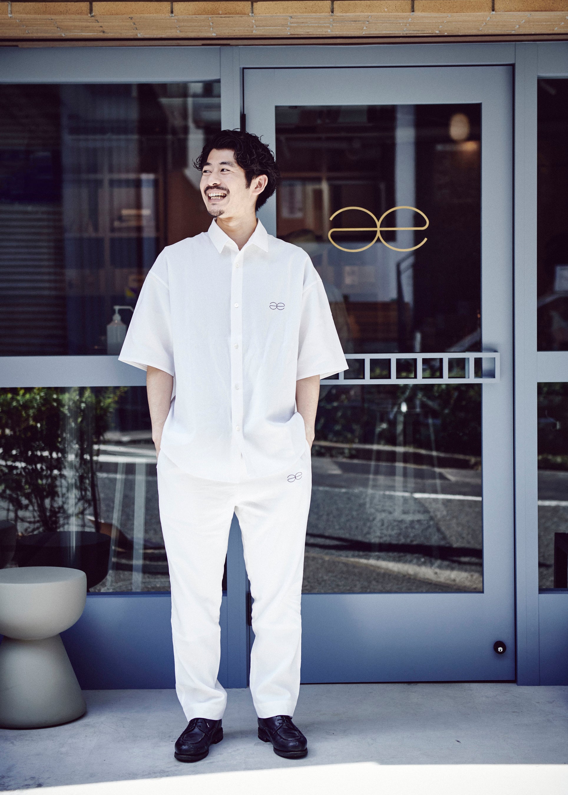 「æ」のスタッフユニフォームは環境に配慮した和紙由来の繊維を用いたもので、最後は土に還る。後閑のNY時代からの友人であり、現在ファッションデザイナーとして環境問題に取り組むマリエさんによるオリジナルデザイン。