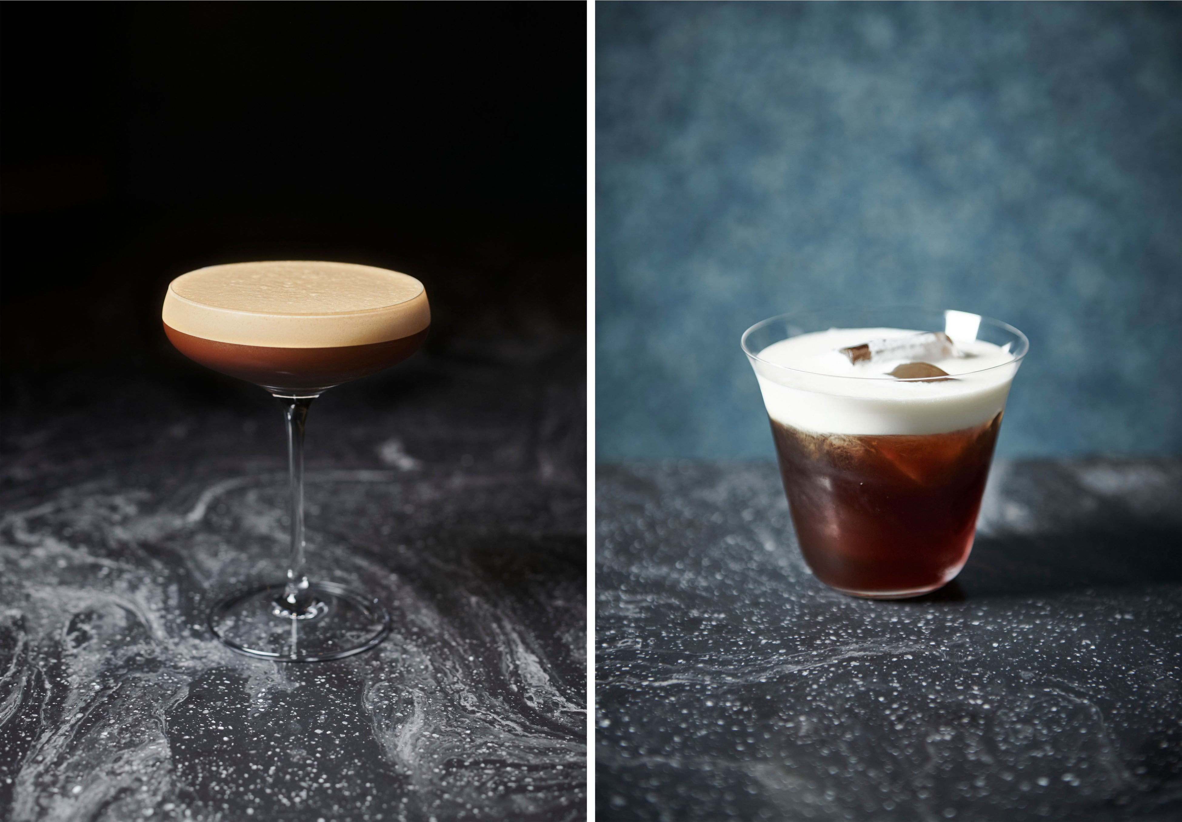 「Coffee Cocktails」は、エスプレッソマティーニなどのスタンダードや、コルタード、フラットホワイトなど、カフェのコーヒーメニューをカクテルにアレンジしたもの。エスプレッソマティーニは苦味が効いてクラシックな深煎りと、華やかなゲイシャ種を用いてフルーティーな浅煎りのバージョンがあり、好みで選んだり、違いを味わうことができます。