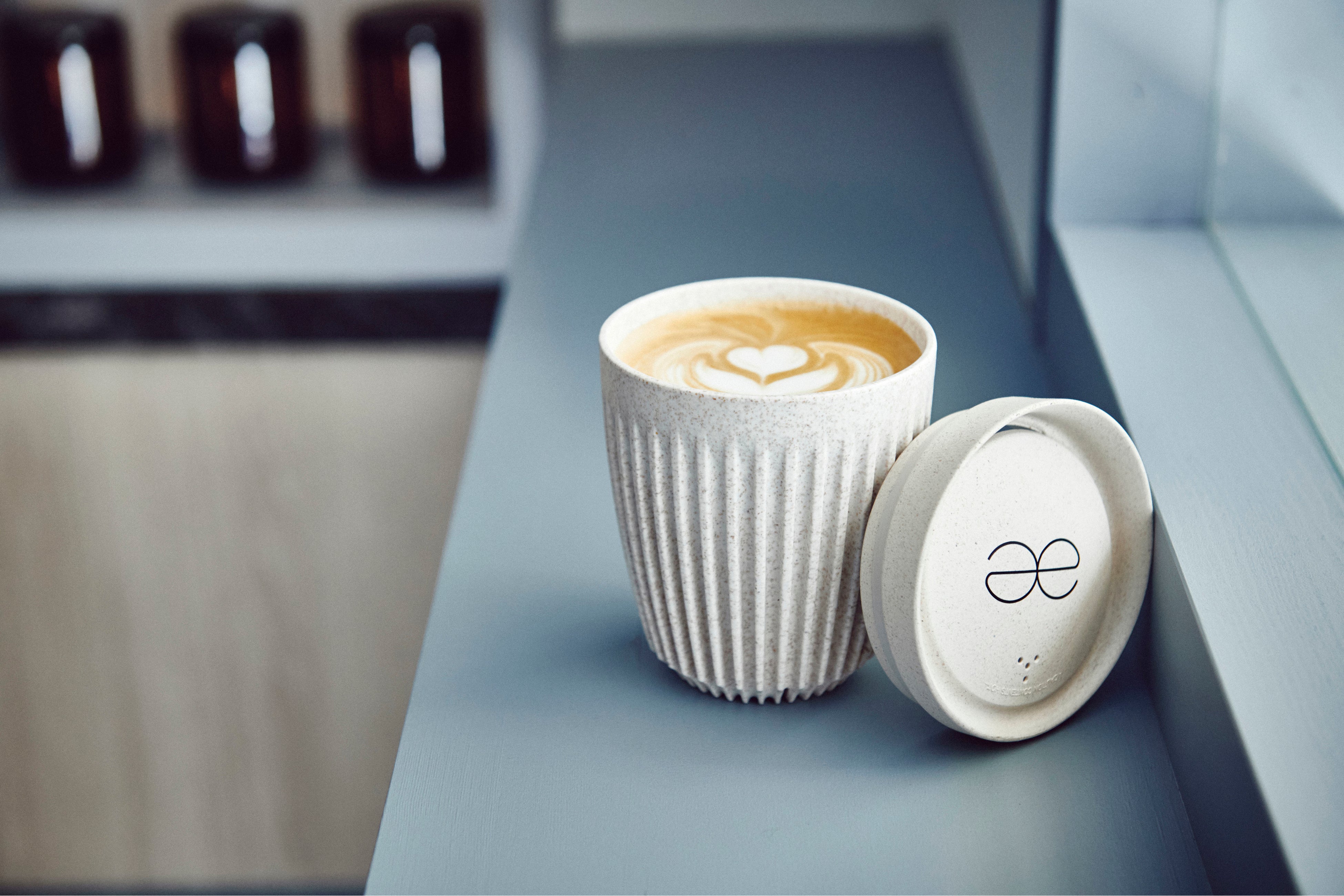 ・テイクアウト用カップ(左)には、繰り返し使えるæオリジナルを用意。コーヒーハスク(コーヒーの実の外皮や殻)を原料の一つとして製造される。