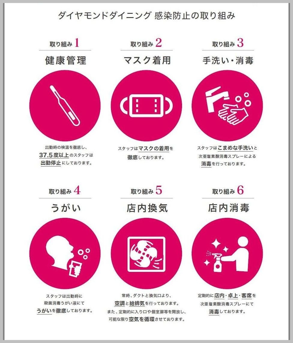 株式会社ダイヤモンドダイニングが運営する各店舗では、お客様に安心してお食事を楽しんでいただくため、行政が定める方針に基づいた感染防止対策を最大限に講じ「PROTECT Guidelines」として実施しております。