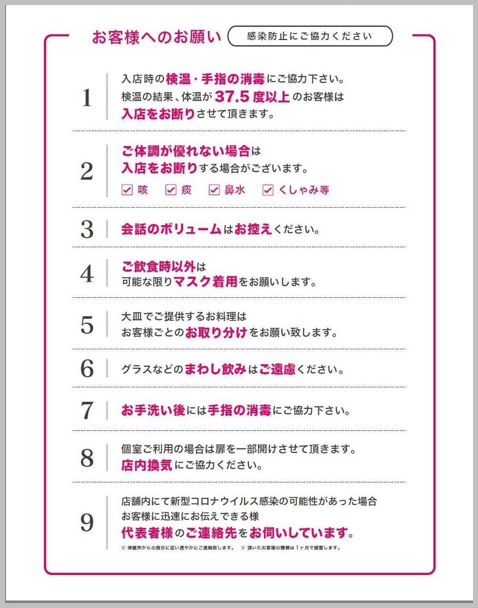株式会社ダイヤモンドダイニングが運営する各店舗では、お客様に安心してお食事を楽しんでいただくため、行政が定める方針に基づいた感染防止対策を最大限に講じ「PROTECT Guidelines」として実施しております。