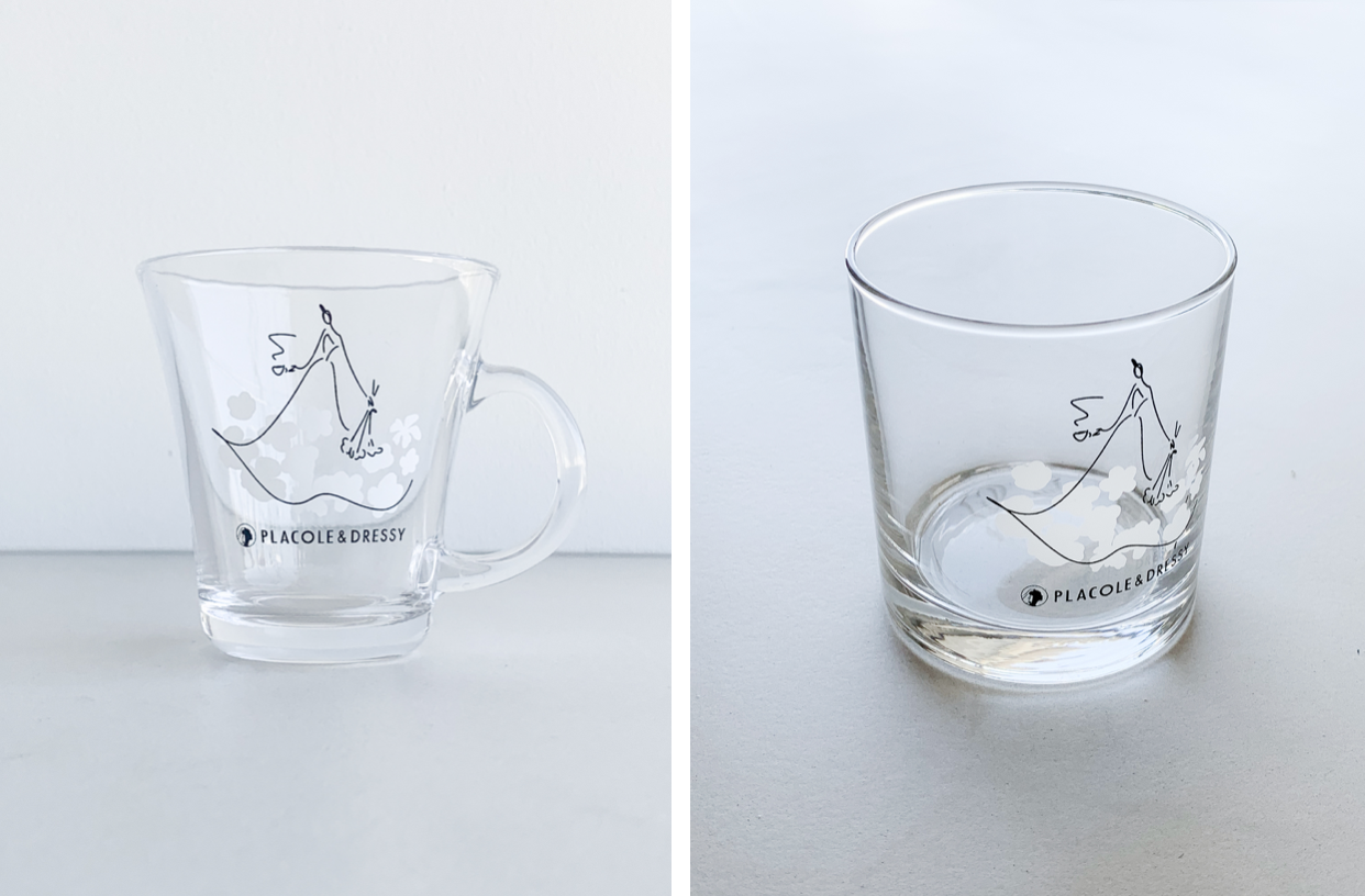 DRESSY ROOM and Teaで随所に使われる、印象的なウェディングドレス姿のイラストが入ったマグ&グラス。色鮮やかなオリジナルドレスアップティーの綺麗なカラーを注ぐだけでまるでウェディングドレスに色づくようにお楽しみいただけます。