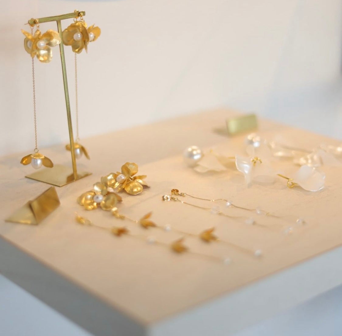 こだわりのウェーブ型ミラーと一緒に展示されているのは、SNSで人気の作家たちとコラボしたオリジナルアクセサリーの数々。自由に試着可能で、その場でQRコードを読み取ると、ECサイト『DRESSY ONLINE』で購入ができる仕組みとなっております。ウェディングのみならず、ギフトや普段使いにもおすすめのデザインを豊富にご用意しております。
