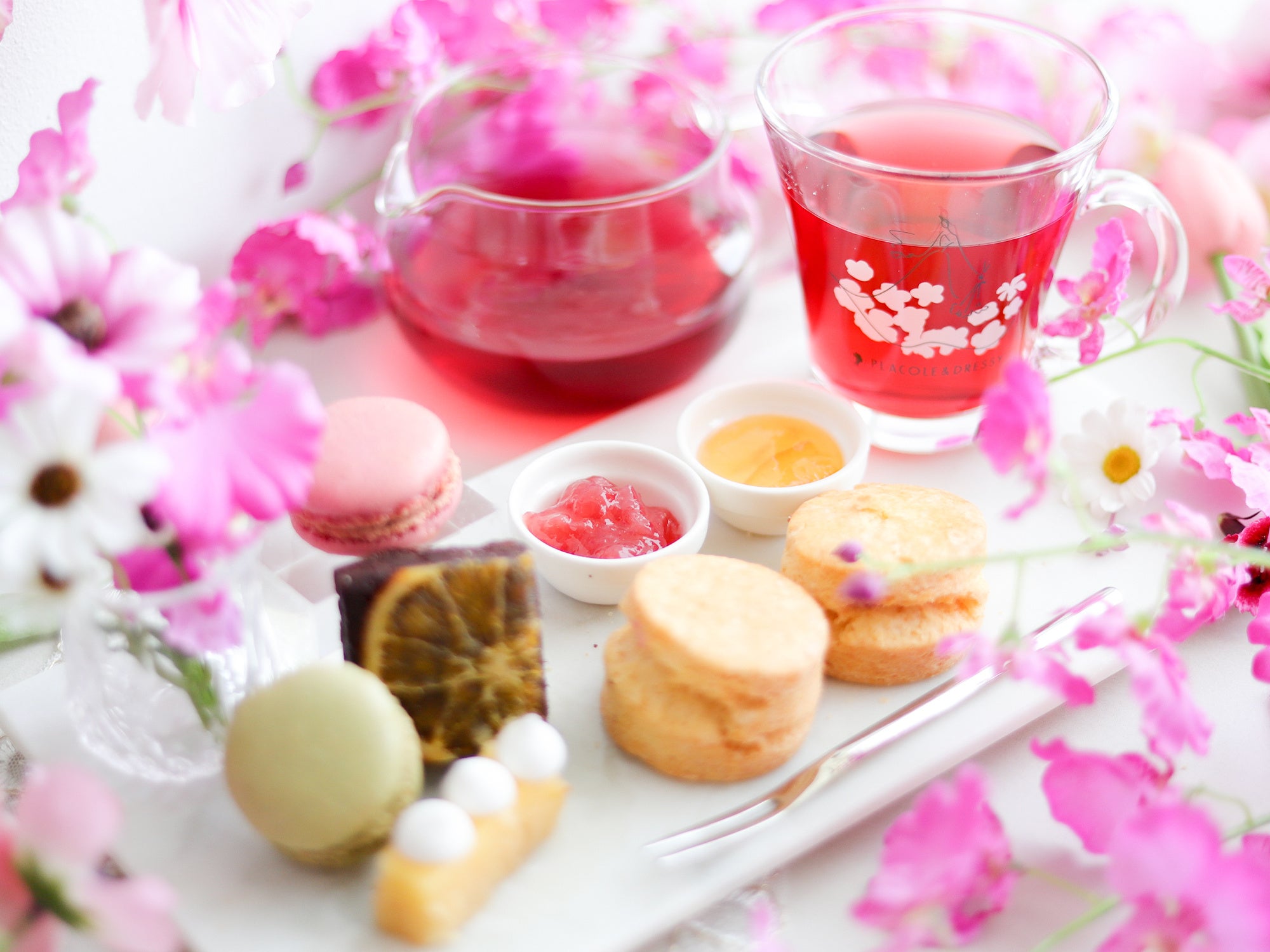 DRESSY ROOM&Teaのおすすめメニュー。スイーツや紅茶、お花を自由に組み合わせて、自分だけのアフタヌーンティープレートを楽しむことができるセット。ドリンク2杯、お好きなスイーツ4種、おひとりさまにもおすすめのサイズとなっております。