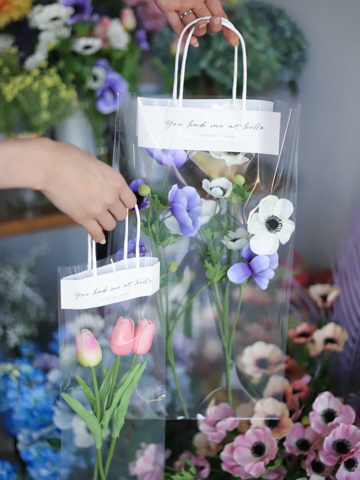 店内にはたくさんのアーティフィシャルフラワーが飾られています。女の子が煌めく花の数々。ウェディングに因んだものや、恋愛運がアップするような素敵な花言葉のアーティフィシャルフラワーを揃えました。お好きな花を束ねて自分だけの花束やブーケを作っていただける体験型コンテンツ。専用の袋もご用意しておりますので、自宅に帰るまでの道のりも魔法はつづいていきます。