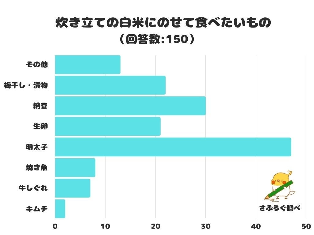 炊き立ての白米にのせて食べたいものをアンケートにて調査したところ、1位は「明太子」でした。