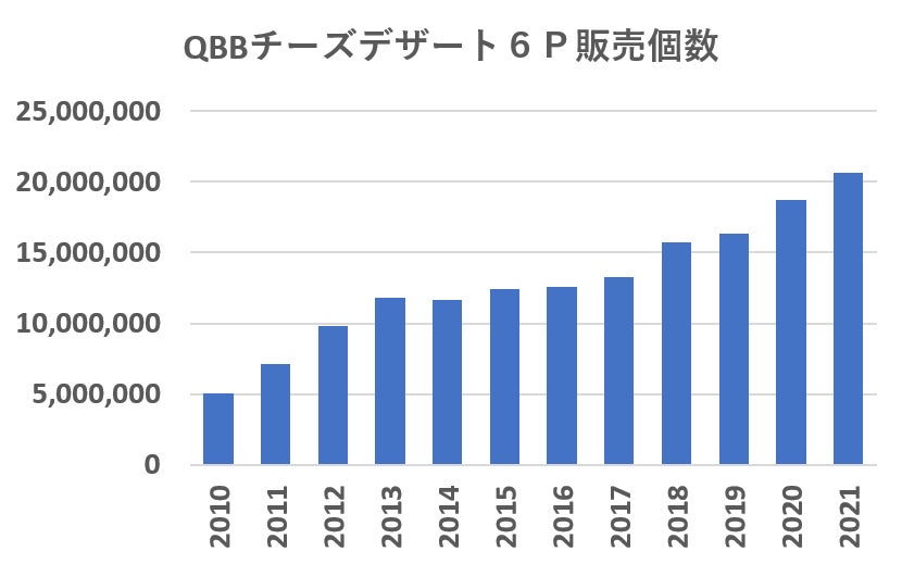 チーズデザート市場約73%のシェアで市場を牽引している「Q・B・Bチーズデザート6P」は、売り上げ・販売個数ともに年々増加しており、成長し続けています。