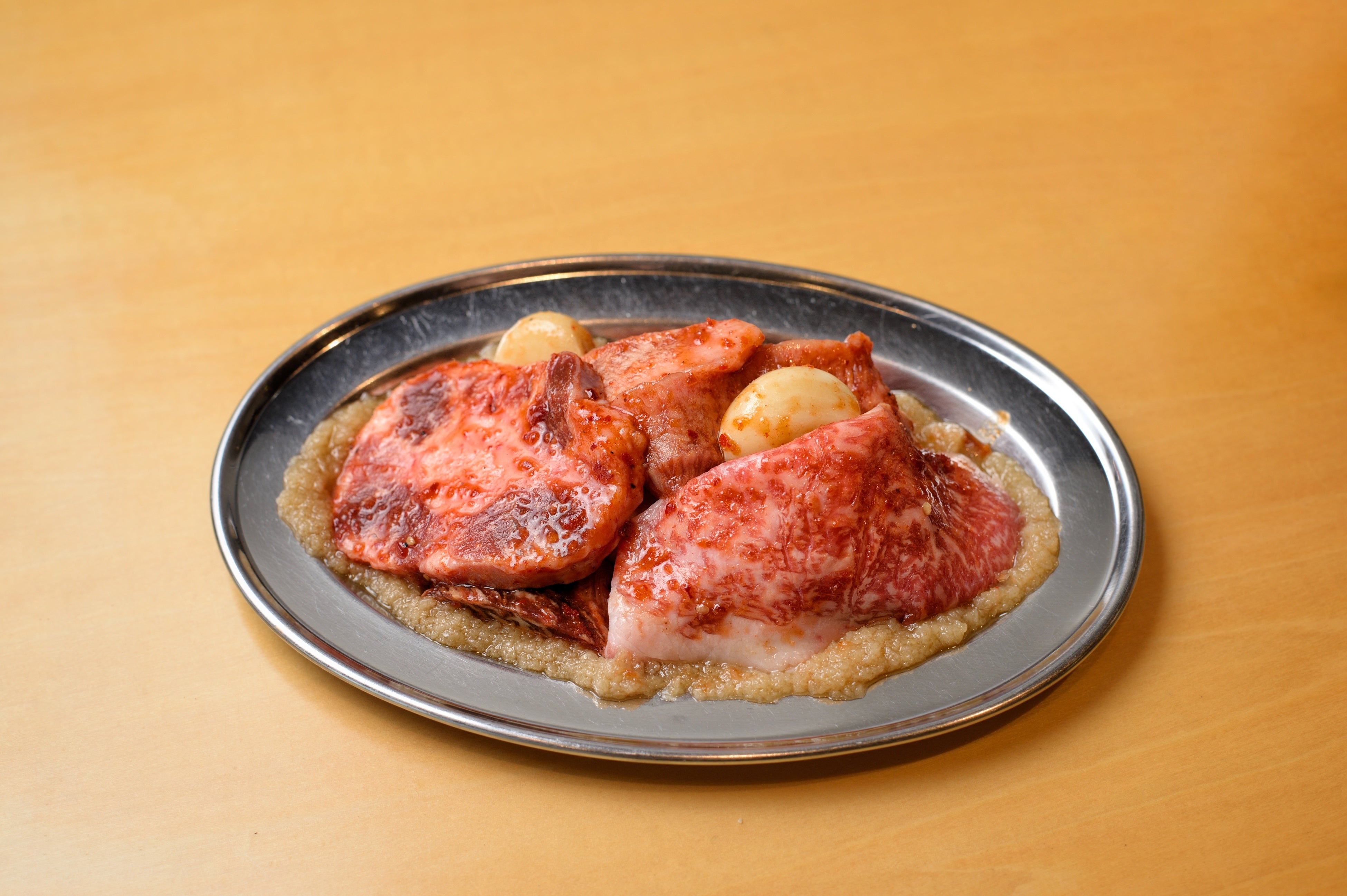 当店の焼肉はにんにくだれをふんだんに絡ませて盛り付けています。