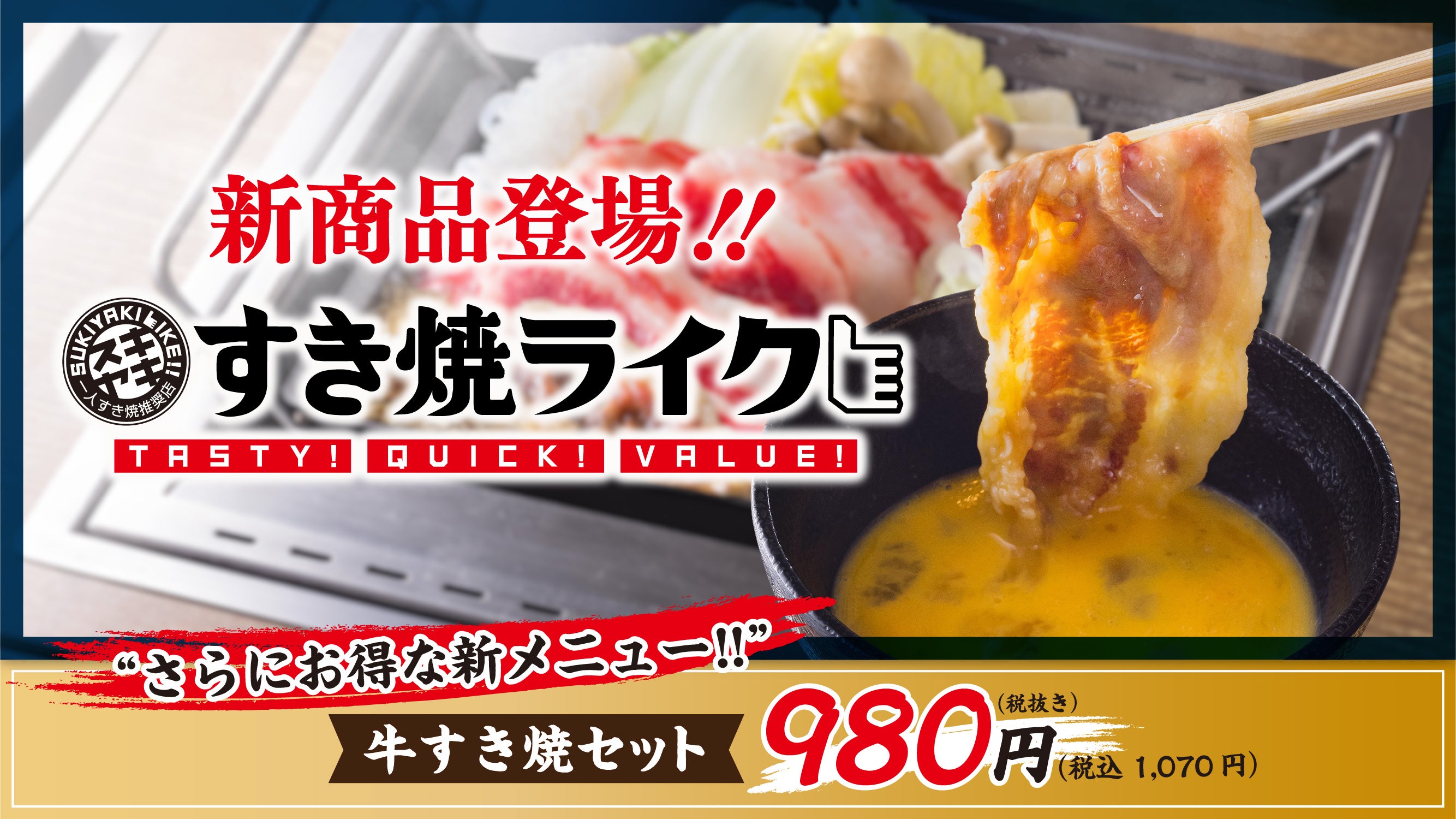 株式会社焼肉ライク(所在地:東京都渋谷区、代表者 有村 壮央)が運営する、ひとりすき焼き専門店「すき焼ライク」は 6月1日(水)から新メニュー「牛すき焼セット 1,070円(税込)」を販売します。今まで1品メニューのみでしたが、より気軽にすき焼きを楽しんでいただきたく、新たにリーズナブルな商品を提供することになりました。
