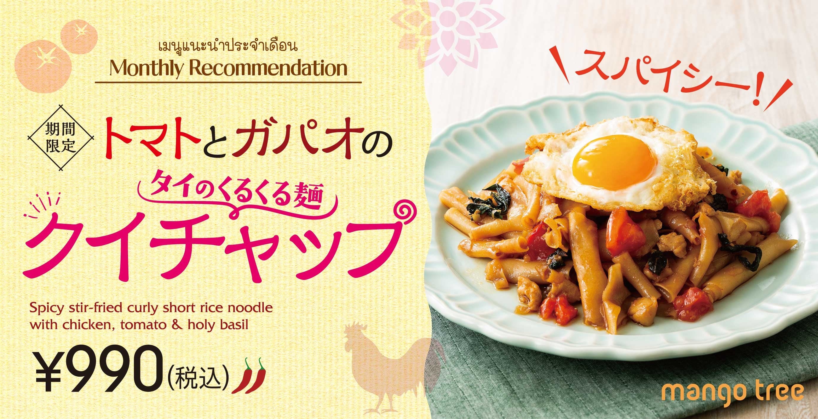 “クイチャップ”は薄いシート状の米粉麺で、茹でるとくるくるっとまるまり、かわいらしい見た目が特徴、タイではよくスープ麺で使われています。通常の麺に比べて面が広いので、濃厚な味つけとの相性がよく、スパイシーな味付けとトマトの程よい酸味と甘み、くるくる麺の歯ごたえが相性ぴったりです。