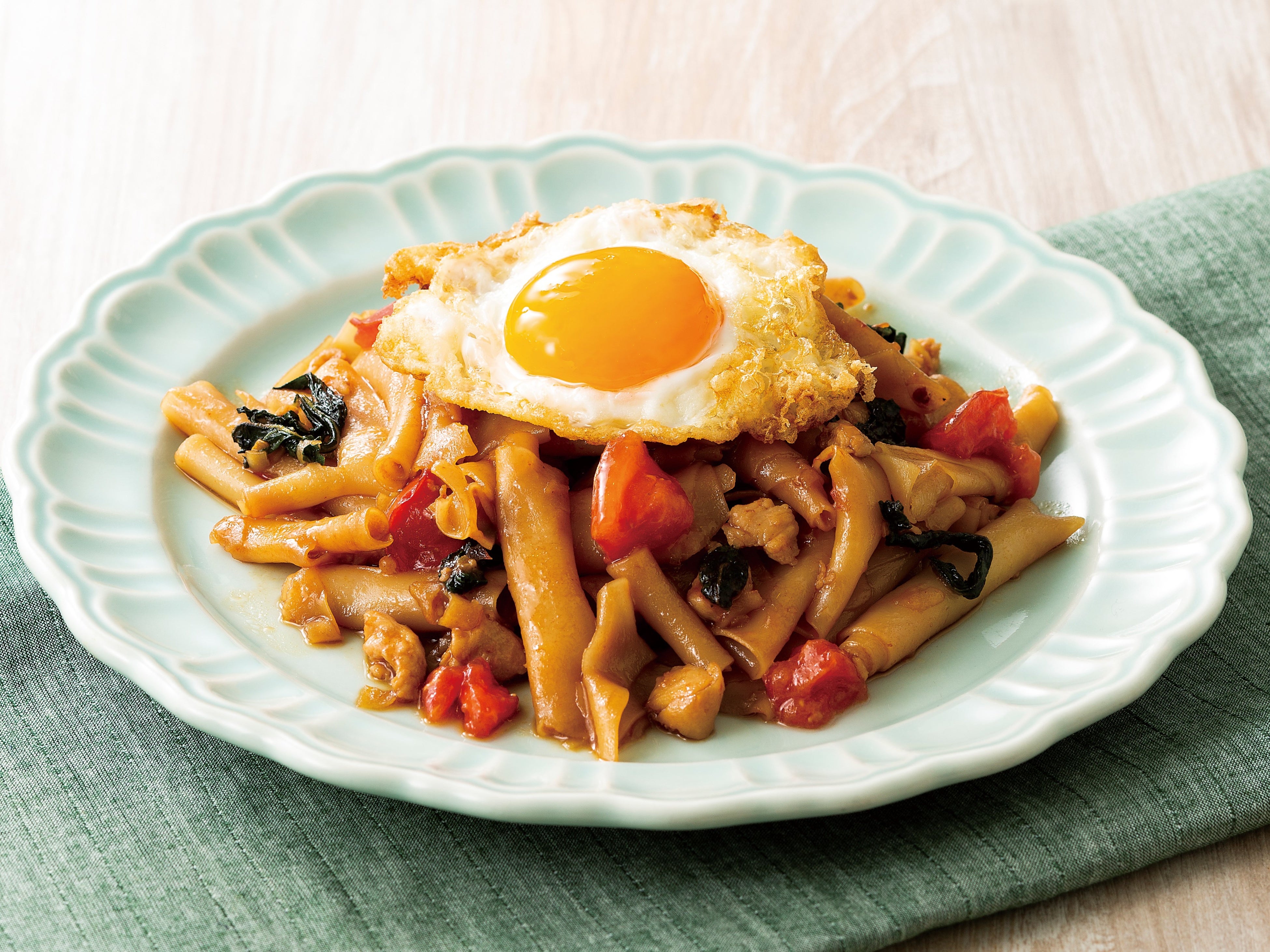 くるくるの米麺“クイチャップ”を粗挽きの鶏肉、トマト、タイの香り高いバジル“ガパオ”と唐辛子、ニンニク、ナンプラー、シーズニングソース(タイの醤油)、オイスターソースで炒めた一皿。