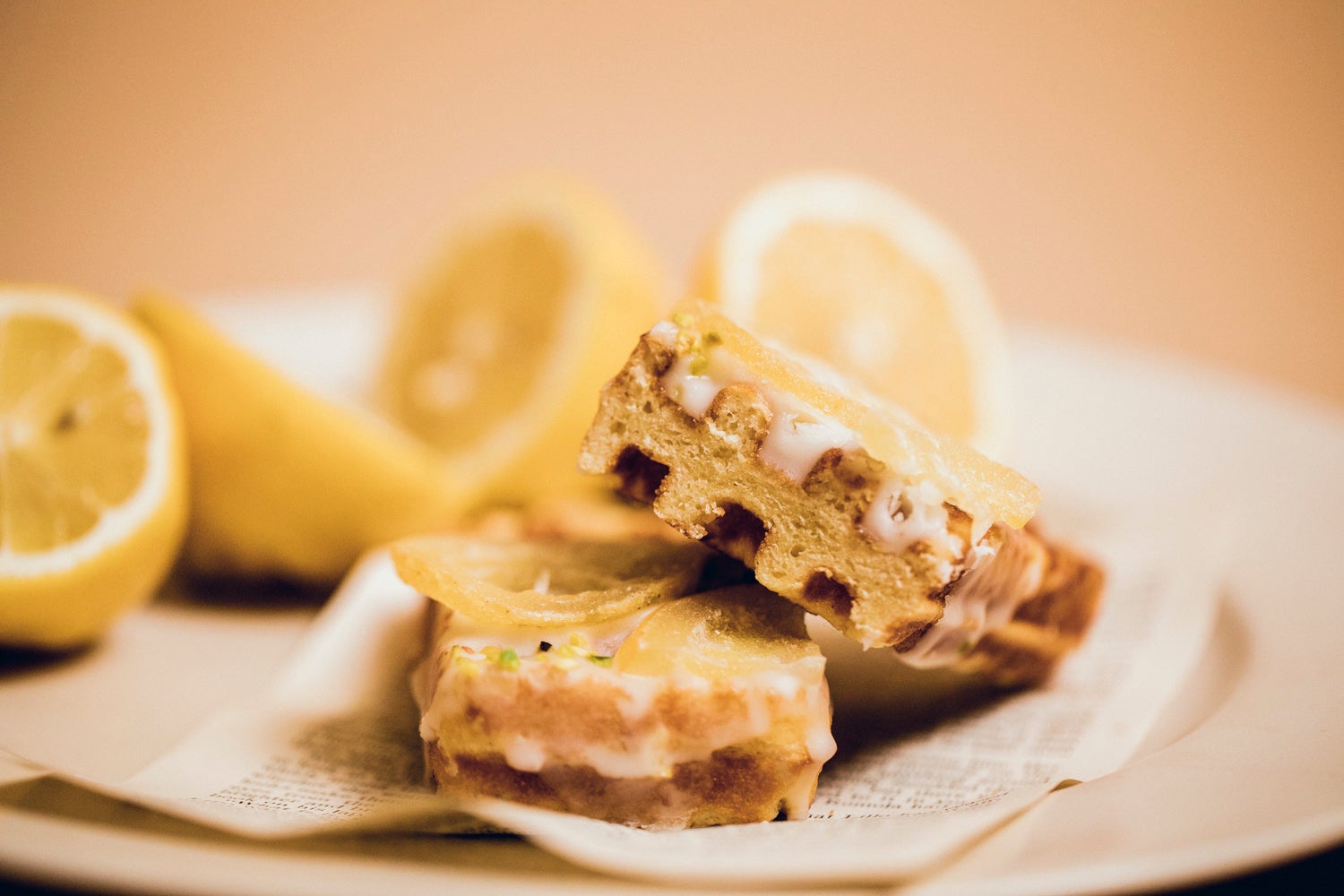 大粒ザラメが入った定番の京ワッフルの生地には、レモン果汁とすりおろしたレモンピールをたっぷりと。焼き上がった生地には、レモン果汁を加えた爽やかな甘さのアイシングでコーティング。トッピングにはドライレモンとピスタチオを贅沢に使用しています。