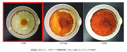 揚げ物をすると部屋中に油のニオイが立ちこめて、気分が悪くなったり食欲がなくなったりする「油酔い」と言われる状態になります。これは加熱による油酔い物質の発生が原因。こめ油はこの物質の発生が他の食用油に比べて少ないので、快適に調理ができ、部屋にイヤなニオイが充満したりすることがありません。