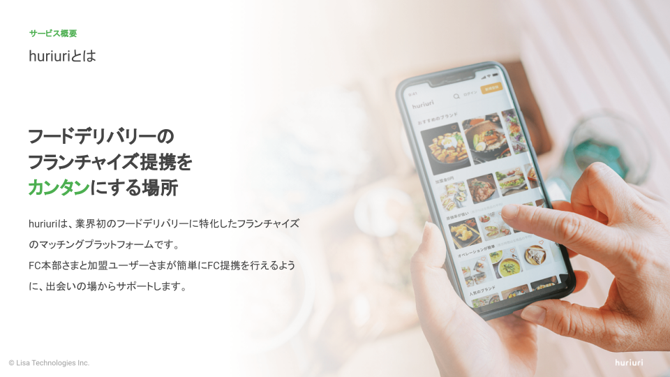 飲食店のフードデリバリーの運営支援を行うLisa Technologies株式会社(本社:東京都中央区、リサテクノロジーズ 代表取締役CEO:西村 龍紀)は、フードデリバリーブランドをカンタンに見つけ・シェアすることができるフランチャイズ(以下、FC)マッチングプラットフォーム『huriuri(フリウリ)』のベータ版(https://huriuri.com/)を本日5月31日に公開しました。