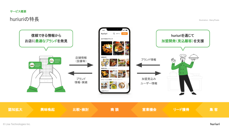 huriuriは、フードデリバリーブランドを保有のFC本部さんと加盟見込みユーザーさんのマッチングを行います。