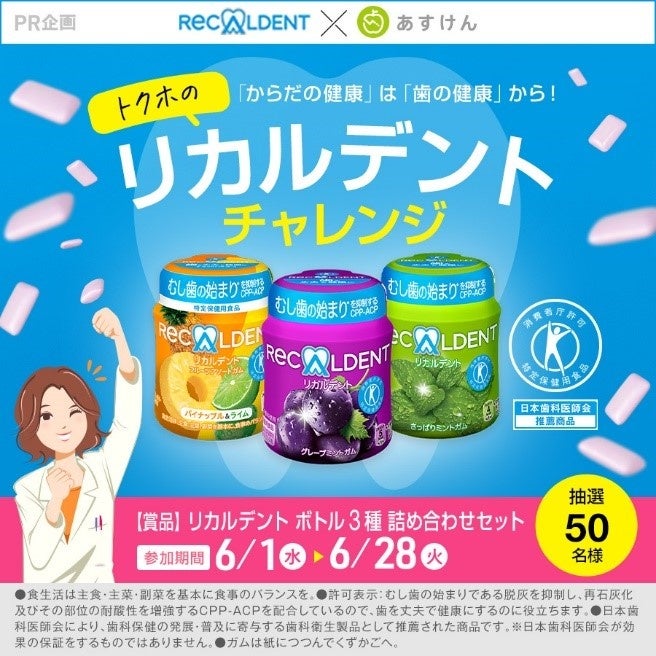 モンデリーズ・ジャパン株式会社(本社:東京都品川区 / 代表取締役社長:福本千秋)は、手軽においしく、歯を大切にしたい人のための『リカルデント』ブランドにて、株式会社asken(東京都新宿区、代表取締役社長 中島洋)が開発・運営するAI食事管理アプリ「あすけん」との共同企画、『トクホのリカルデントチャレンジ <「体の健康」は「歯の健康」から!>』を2022年6月1日(水)より実施いたします。