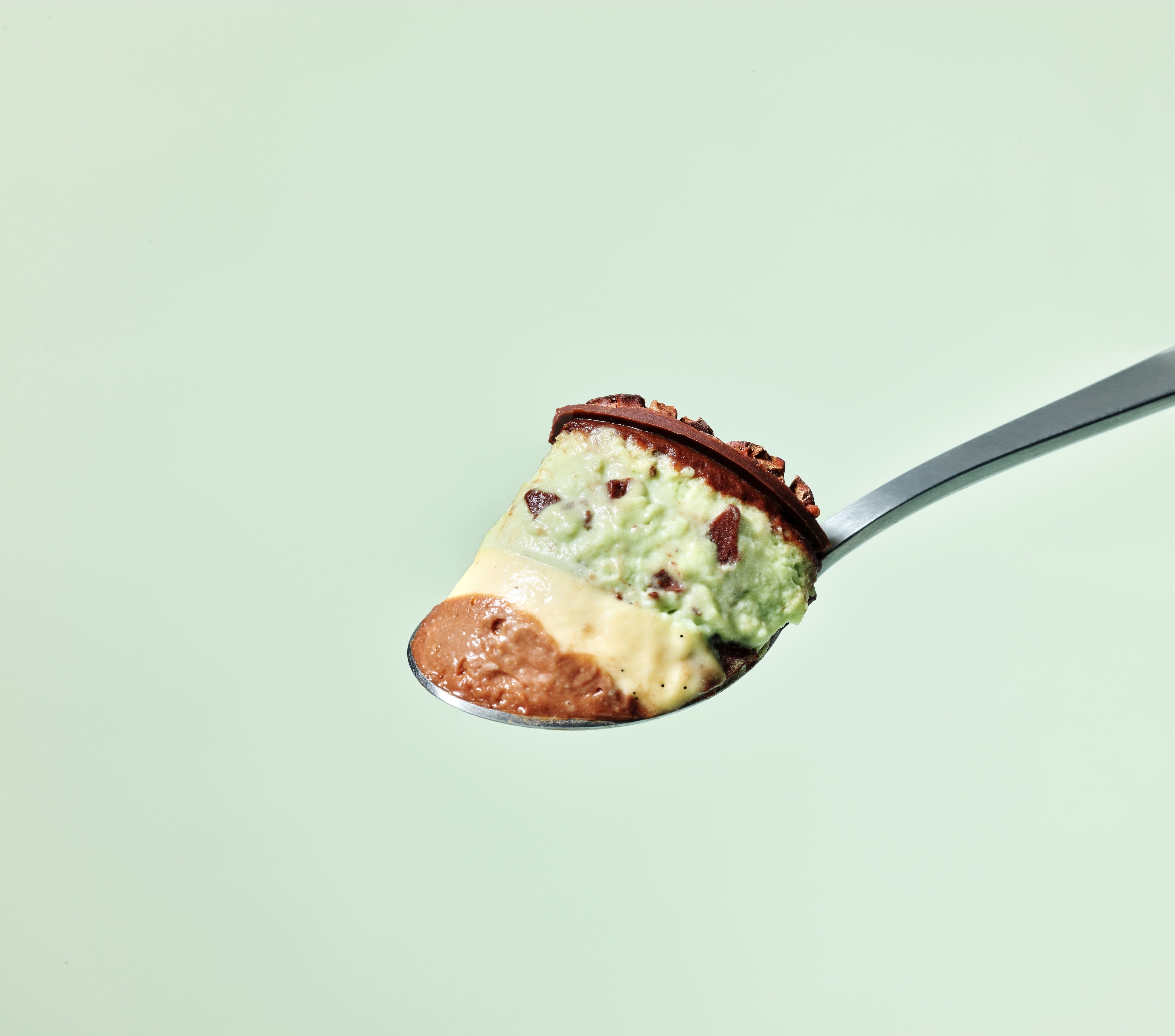 チョコミント味は実は苦手…そんなシェフ宮根が、 自分でも満足できる上品なチョコミントスイーツをカカオクリュで作りたい!という挑戦から生まれた「カカオクリュチョコミント」。組み合わせるカカオ豆には個性の強いミントに負けないインドネシア産をチ ョイス。スパイシーな香りが特長です。また、チョコミントムースを引き立てるセンターソースにはクリームブリュレを採用。小麦を使わないふんわりとしたビスキュイショコラ(ココアのスポンジ)の苦味も加わり、爽快感・甘味・苦味のバランスが良い自慢の一品が生まれました。