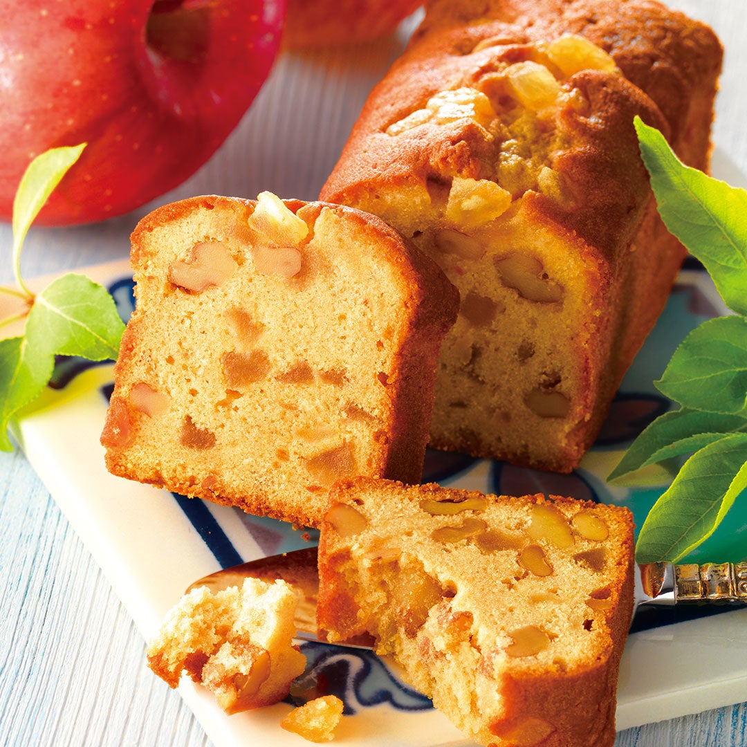 丁寧に煮詰めた自家製キャラメルを練り込んだ生地に、アップルリキュールに漬け込んだ刻みりんごと、カリッとしたくるみを入れて、しっとりと焼き上げたパウンドケーキです。生地に「ゲランドの塩」を練り込み、コクと風味を一層際立たせました。