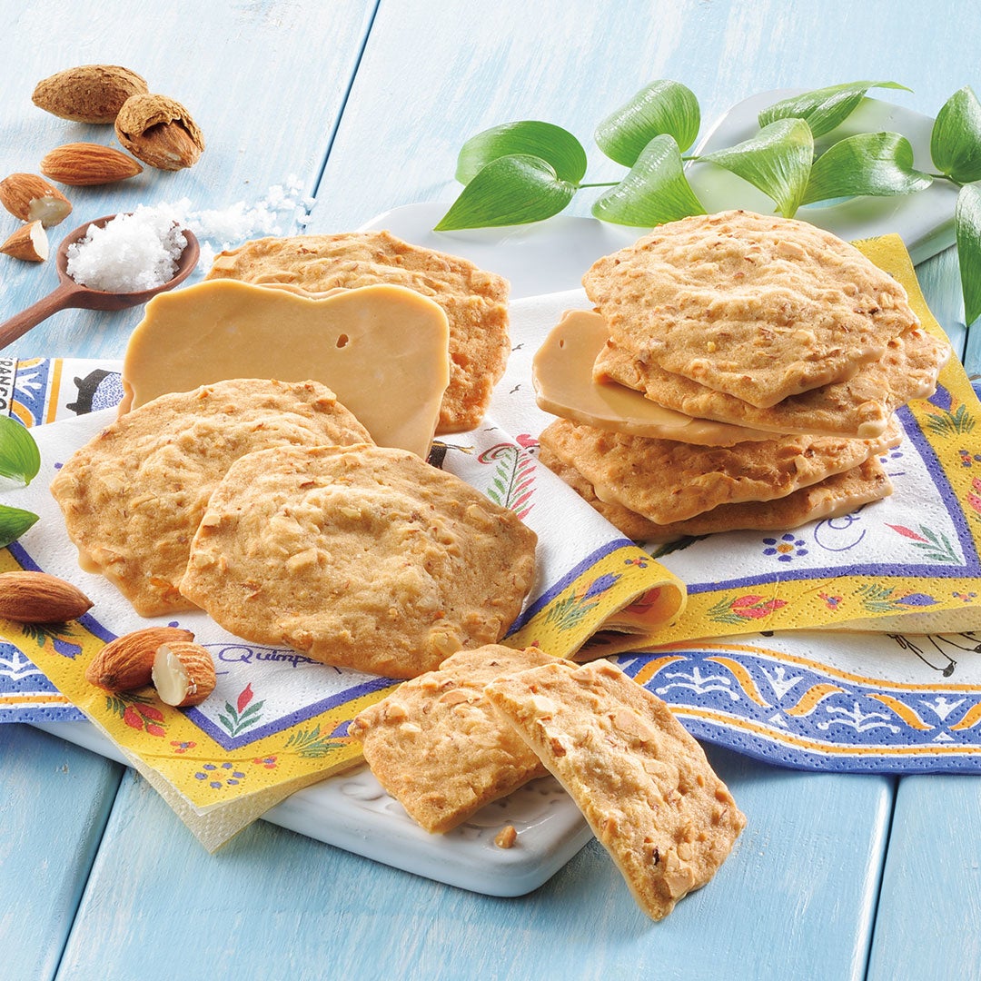 砕いたアーモンドと「ゲランドの塩」、ラム酒を入れた生地を焼き上げ、片面にキャラメルチョコレートをコーティングした、歯触りの心地よいサブレです。アーモンドは皮付きと皮なしの風味の異なる2種類を使用しています。サクッとほろっとした食感と、甘さと塩味の絶妙なバランスをお楽しみください。