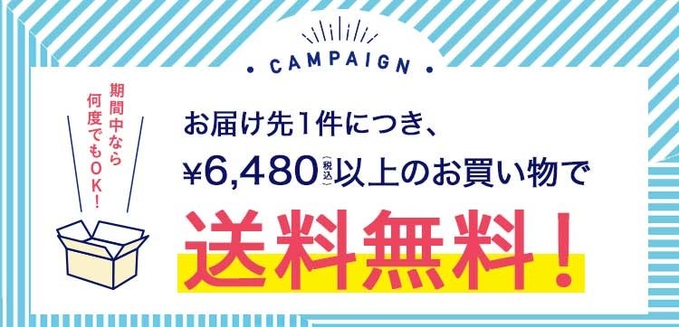 お届け先1件につき、商品代金6,480円(税込)以上ご購入で、送料が無料となるキャンペーンを開催しています。 期間中は何度でもご利用いただけます。この機会にぜひお買い物をお楽しみください。