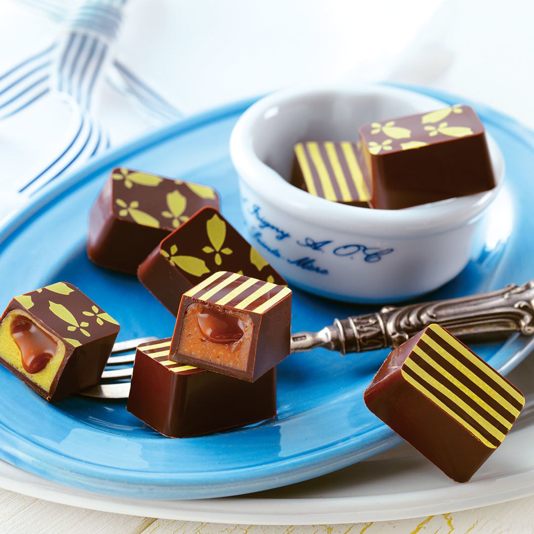 なめらかなキャラメルソースをガナッシュの中に入れ、甘さ控えめのチョコレートに閉じ込めた、2種類のプラリネショコラ。キャラメルや「ゲランドの塩」、ピスタチオの風味がチョコレートととけ合う、贅沢でリッチな味わいをお楽しみください。