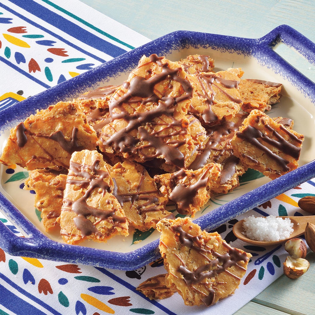 「ゲランドの塩」を練り込んだバターの風味豊かな生地に、飴でからめたヘーゼルナッツとマカダミアナッツをのせて焼き上げました。ブルターニュ銘菓「ガレットブルトンヌ」のほろほろとした独特な食感を、たっぷりのナッツと一緒にお楽しみください。