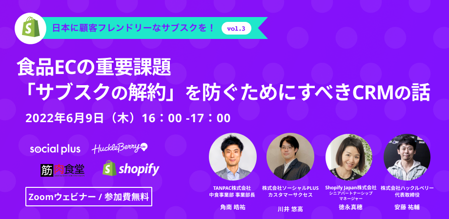 2022年6月9日、株式会社ソーシャルPLUS(所在地:東京都文京区、代表取締役:岡田 風早)は、株式会社ハックルベリー主催の無料オンラインセミナー「食品ECの重要課題 サブスクの解約を防ぐためにすべきCRMの話」に登壇します。