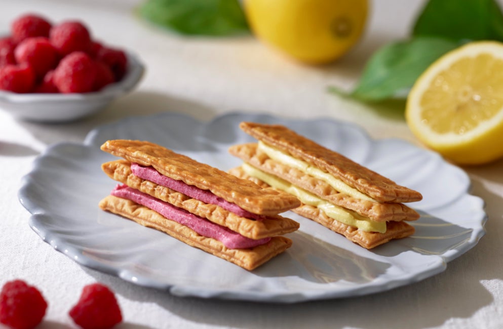 フランス産の小麦パイ生地を使用した、“サクッ”とした食感が特徴のこだわりのフィユタージュに、爽やかな香りのレモンクリームと甘酸っぱいフランボワーズクリームをそれぞれサンドいたしました。
