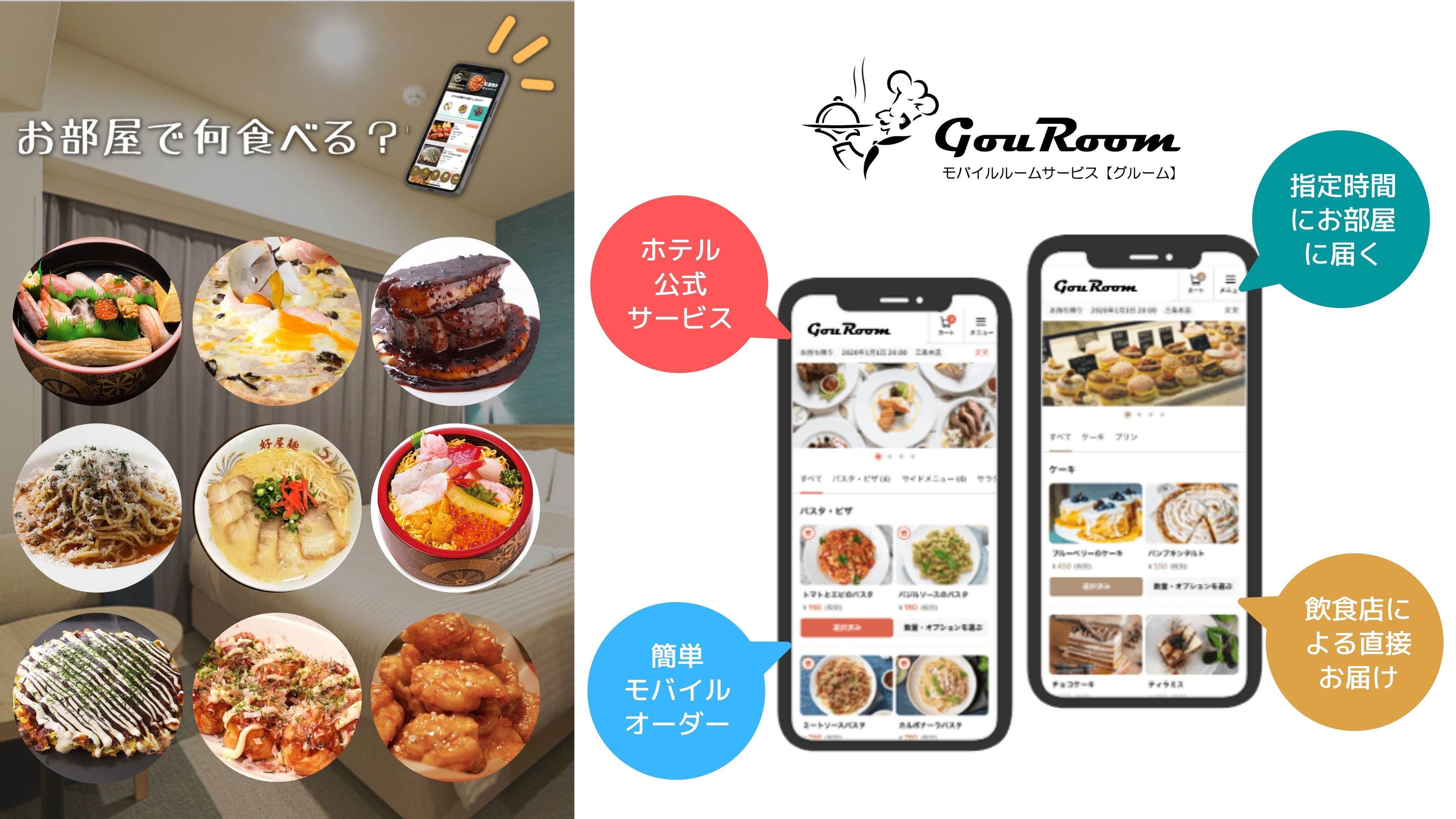 専用モバイルオーダーからの注文でお部屋に食事が届く簡易ルームサービスを実装することにより、安心・安全・便利な食事の選択肢を提供するだけではなく、宿泊事業者様に対してホテル稼働率・売上UP、ホスピタリティの向上・コスト削減・インバウンド対策を目的としたGouRoomの提供を開始いたしました。
