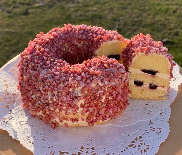 バタークリームのまわりには、アーモンドとハスカップでおつくりしたクロカントをたっぷり、ほろほろとした食感が特徴的です。バタークリームにさわやかさと軽さをだすために、ココナッツオイルを合せています。