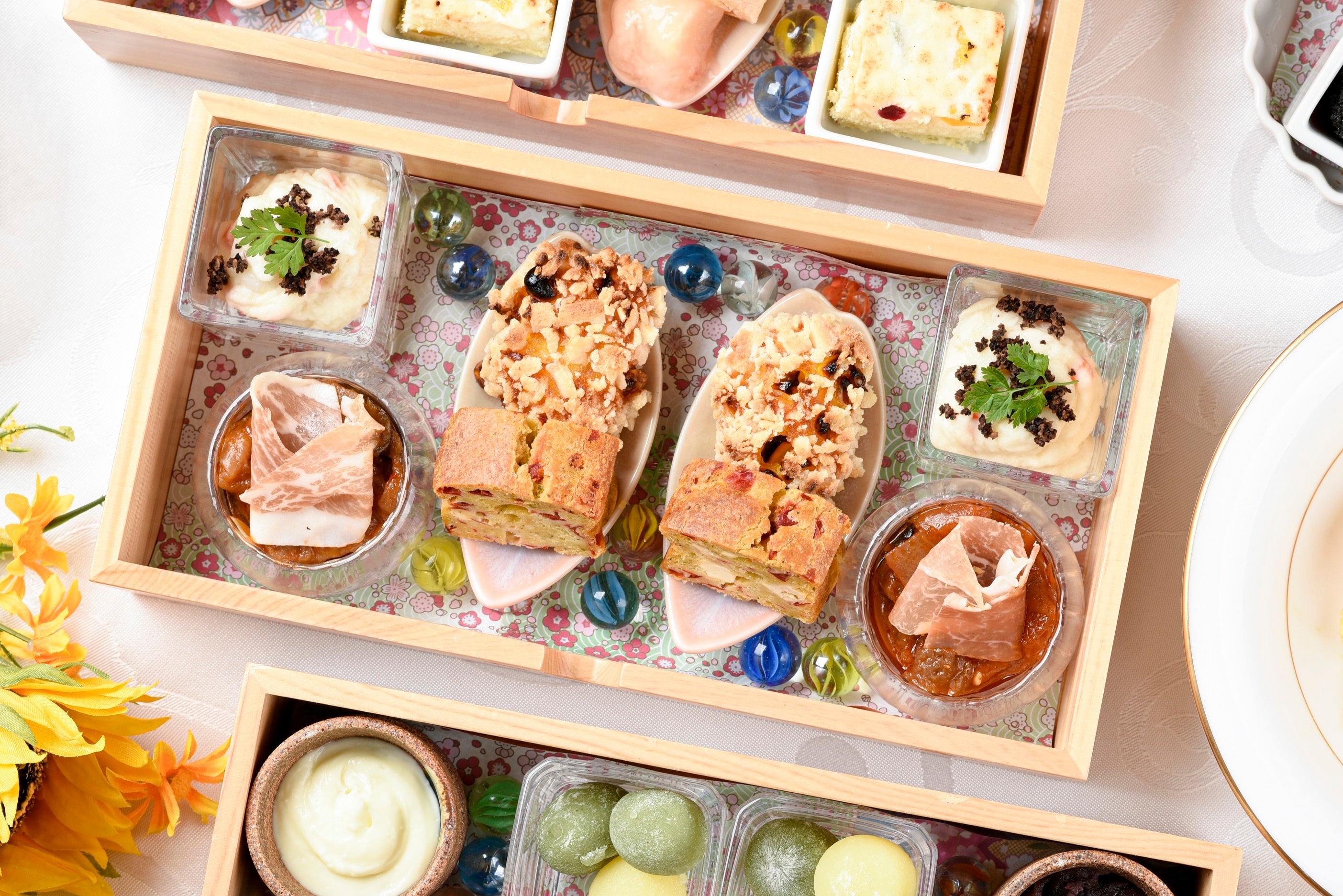 セイボリーでは、「バジルとチーズのケークサレ」「トリュフ風味のtccポテトサラダ」「コーンクリームあられ」が新登場。定番人気の当店のスペシャリティ「ズワイ蟹のクリームコロッケ 」や「ミニオムライス」、昔ながらの味わい「自家製カスタードプリン」もお楽しみいただけます。