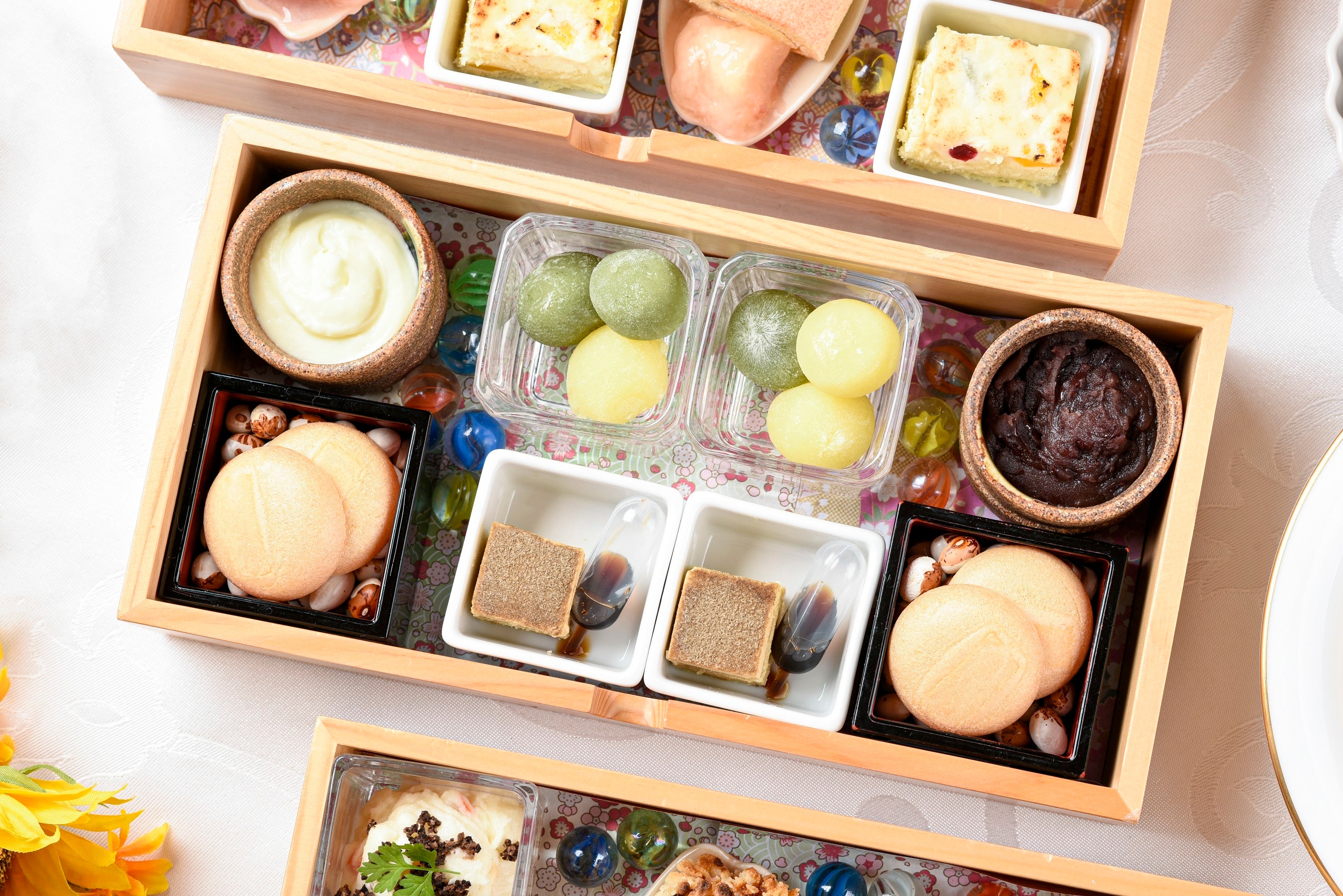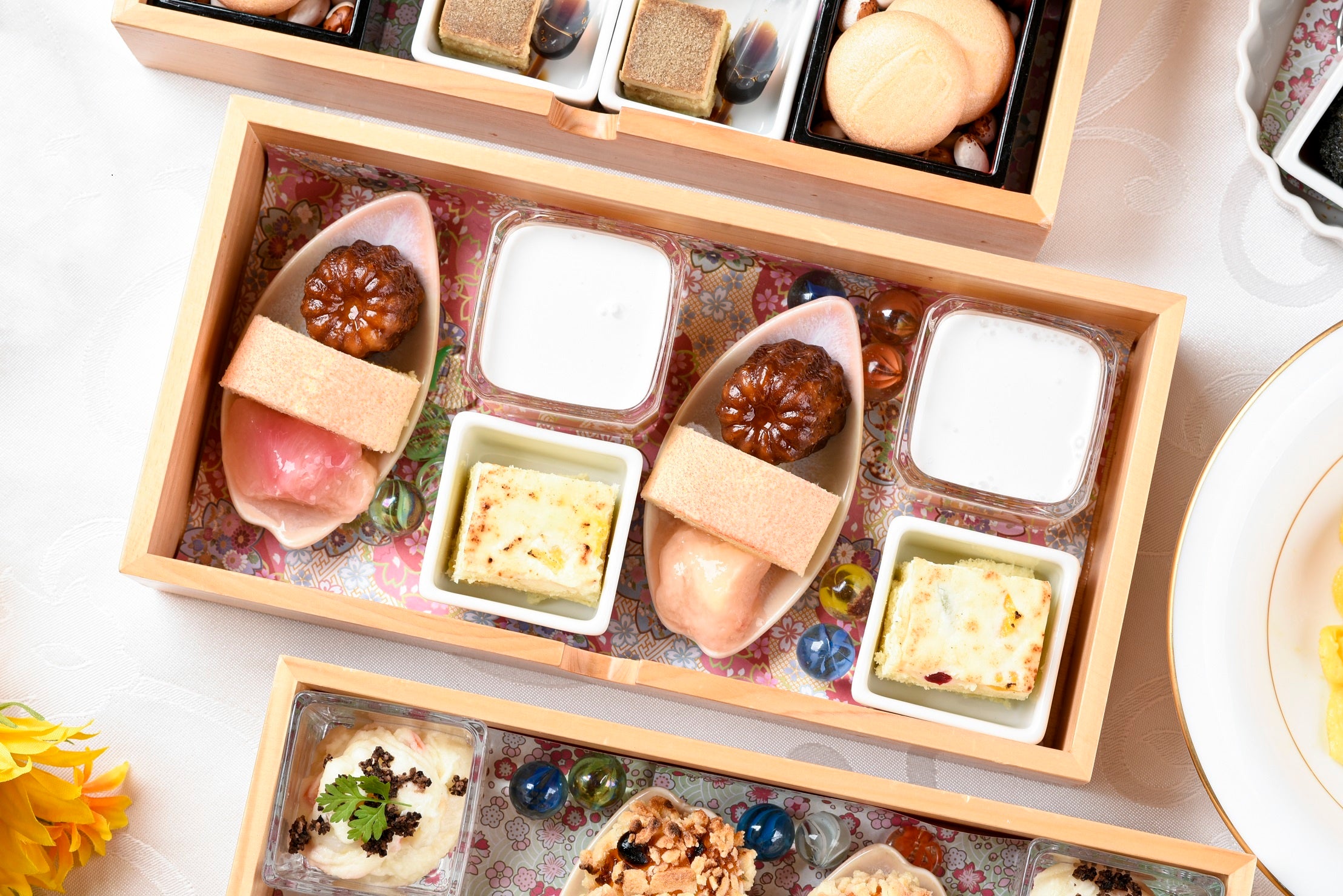 アフタヌーンティーセットは檜の岡持ちで登場。3段の引き出しを開けると、見た目も美しいスイーツとセイボリーが現れ、まるで玉手箱を開けるかのような演出に心躍ります。季節を意識した洋スイーツに加え、北海道産小豆のあんことマスカルポーネの最中など進化した和のスイーツもご提供します。また、当店の洋食のエッセンスを感じられるセイボリーの充実度も特長の1つ。バリエーション豊富な味わいで、甘いものばかりでは飽きてしまうという方でも「GINZAの洋食のアフタヌーンティーは最後まで楽しめる」「ランチとしても楽しめる」といった声を多数いただいております。