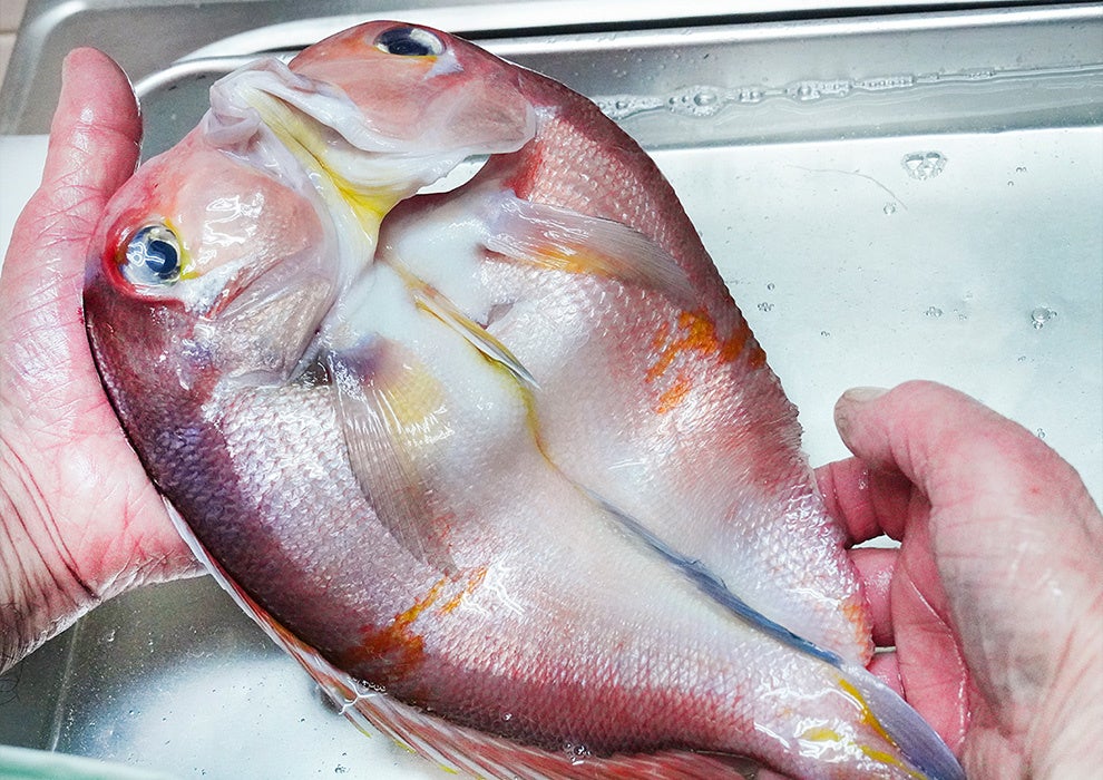 魚を開いたら、徹底的に水洗いをし、血などの臭みのもとをなくします。次に「海水程度の塩水で海の状態に一度戻してやります。そうすると綺麗な色が蘇ります」と、中村さん。実に丁寧な仕事です。