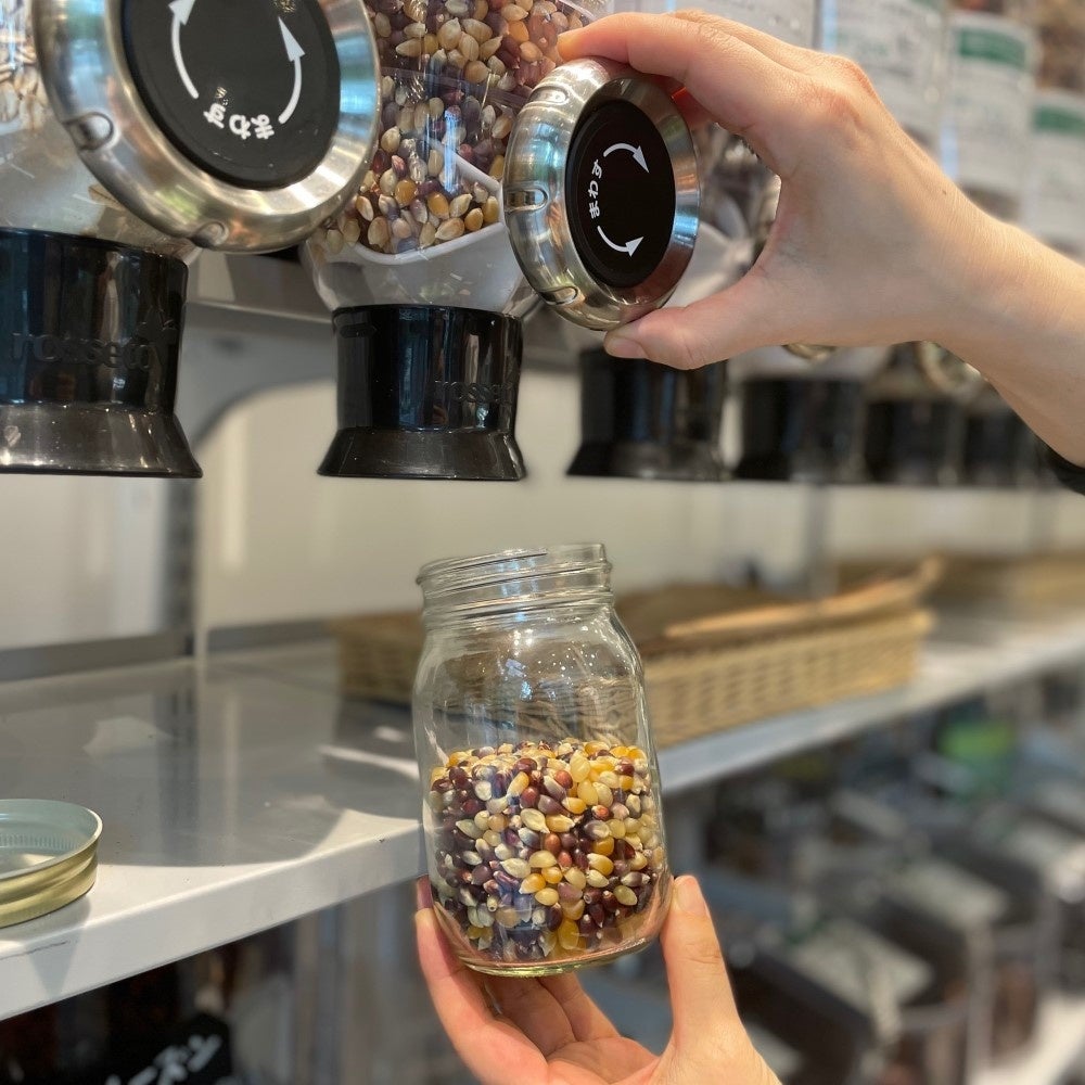 使う分だけを少量(20gから)で購入できる食品ロス削減の仕組みは創業当初よりご支持いただいております。店舗におけるサステナブル推進の次のステップとして容器の持ち込みを可能とし、更なるごみの削減にも取り組みます。