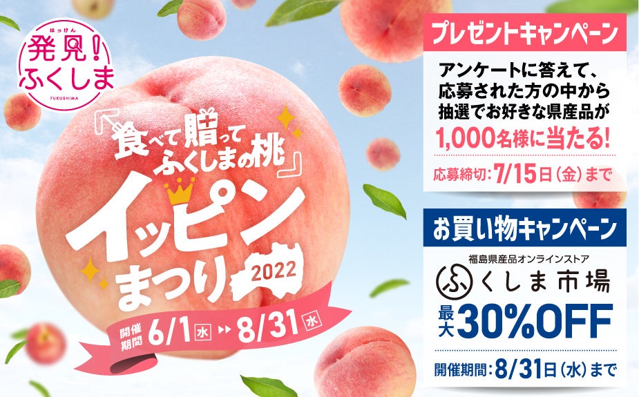 株式会社スペースワン(本社:福島県郡山市)は、2022年6月1日(水)~8月31日(水)の期間中、東京電力ホールディングス株式会社が福島県産品のおいしさや魅力発信を目的として開催する「食べて 贈って ふくしまの桃・イッピンまつり2022」を受託運営いたします。スペースワンが運営する福島県産品オンラインストア「ふくしま市場」では、県内事業者の販路・消費拡大を目指す取り組みを継続中です。同キャンペーンでは、7月15日(金)まで、アンケートにお答えいただいた方の中から、総計1,000名様に旬の桃、福島牛、水産品をプレゼント。また、対象商品が最大30%引きとなるセールを同時開催いたします。