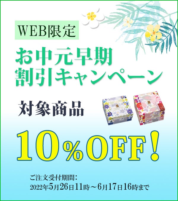 6月17日(金)午後4時までに、弊本舗のWEBサイトよりご注文いただくと、夏の贈り物に最適な詰合せが10%割引になる「早割キャンペーン」を実施中です。2022年の父の日は6月20日(日)、お中元は全国的に7月初旬から8月15日ごろまでに送るのが一般的です。普段お世話になっている方へ感謝と大切に想っている気持ちをのせてお届けします。